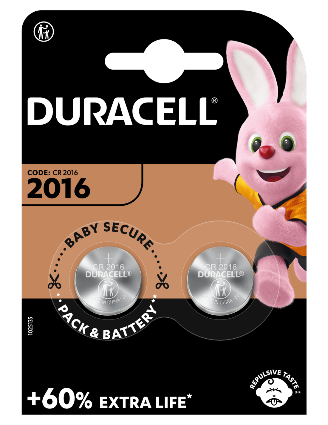 DURACELL 2016 liitiumpatareid on pakendatud avamiskindlasse kahepoolsesse blistrisse, mida on lapsel ilma käärideta võimatu avada. Lisaks on patareid kaetud kibeainega Bitrex®, et vältida nende allaneelamist.