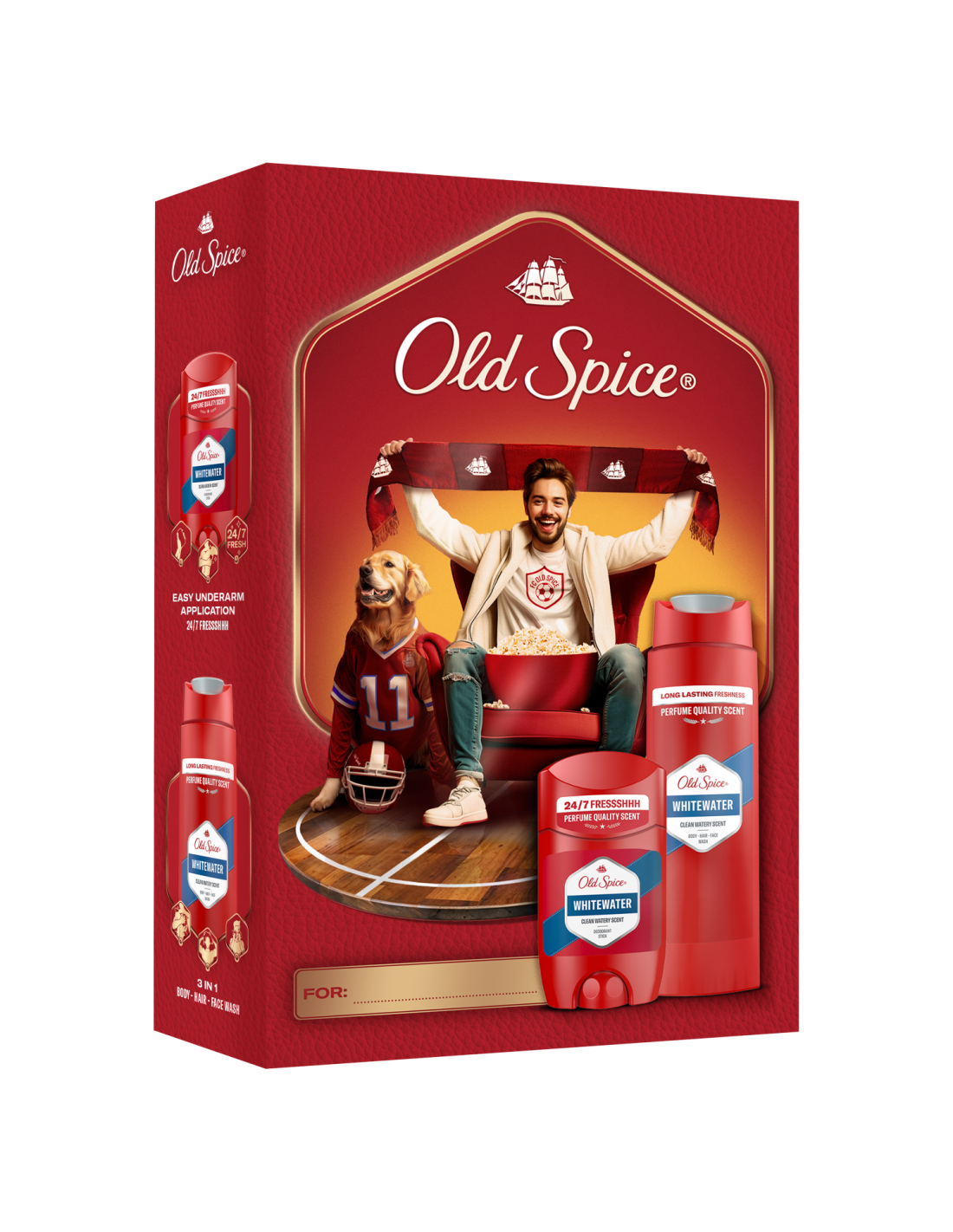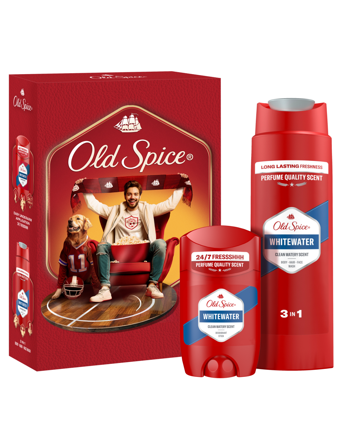 Otsid ideaalset kingitust spordifännile, kes innustab kirglikkuse, entusiasmi ja legendaarse lõhnaga? Siin see on! Kingituskomplekt sisaldab Whitewater meestele mõeldud kuiva deodoranti ja dušigeeli, mis on kaunilt pakitud Sports Fan disainiga kartongkarpi. Old Spice Whitewater kvaliteetne aroom ei vea sind alt: värske vee, sandlipuu, sidruni ja merevaigu nootide lõhn muudab sind tõeliselt vastupandamatuks. Miks ei ole see Old Spice’i kingituskomplekt veel sinu ostukorvis? (*kasutades dušigeeli ja deodoranti).