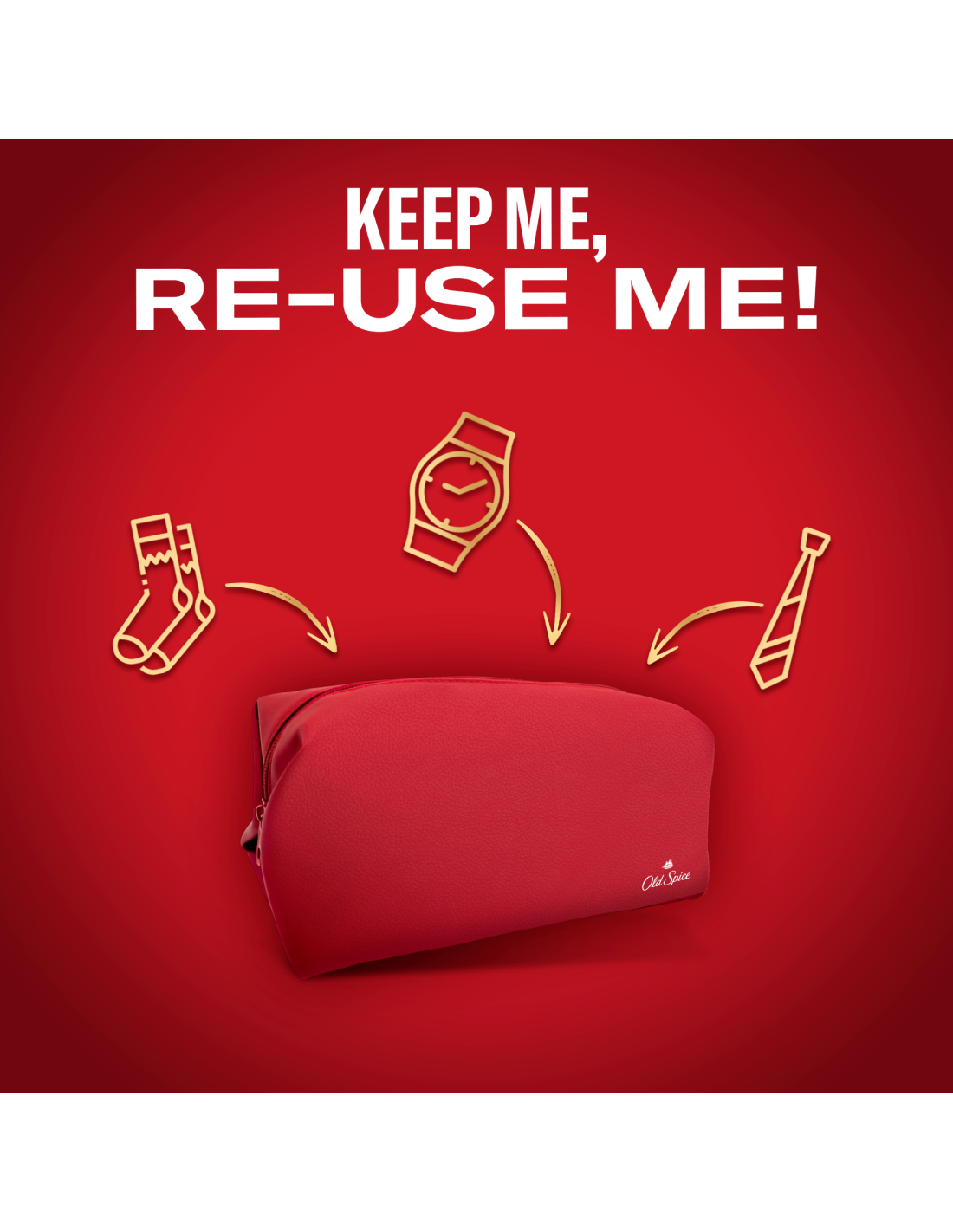 kaunilt pakitud erilisse Old Spice’i kosmeetikakotti, mida saab korduvalt kasutada tualett-tarvete kaasavõtmiseks reisile või trenni