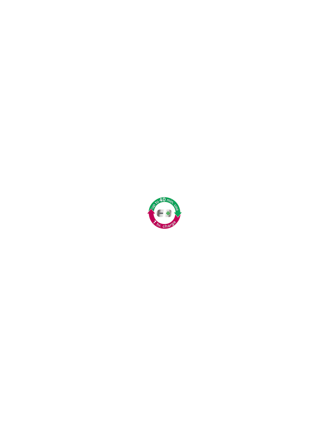 Töötab aku toitel 40min. (kiire laadimine 1h.)
