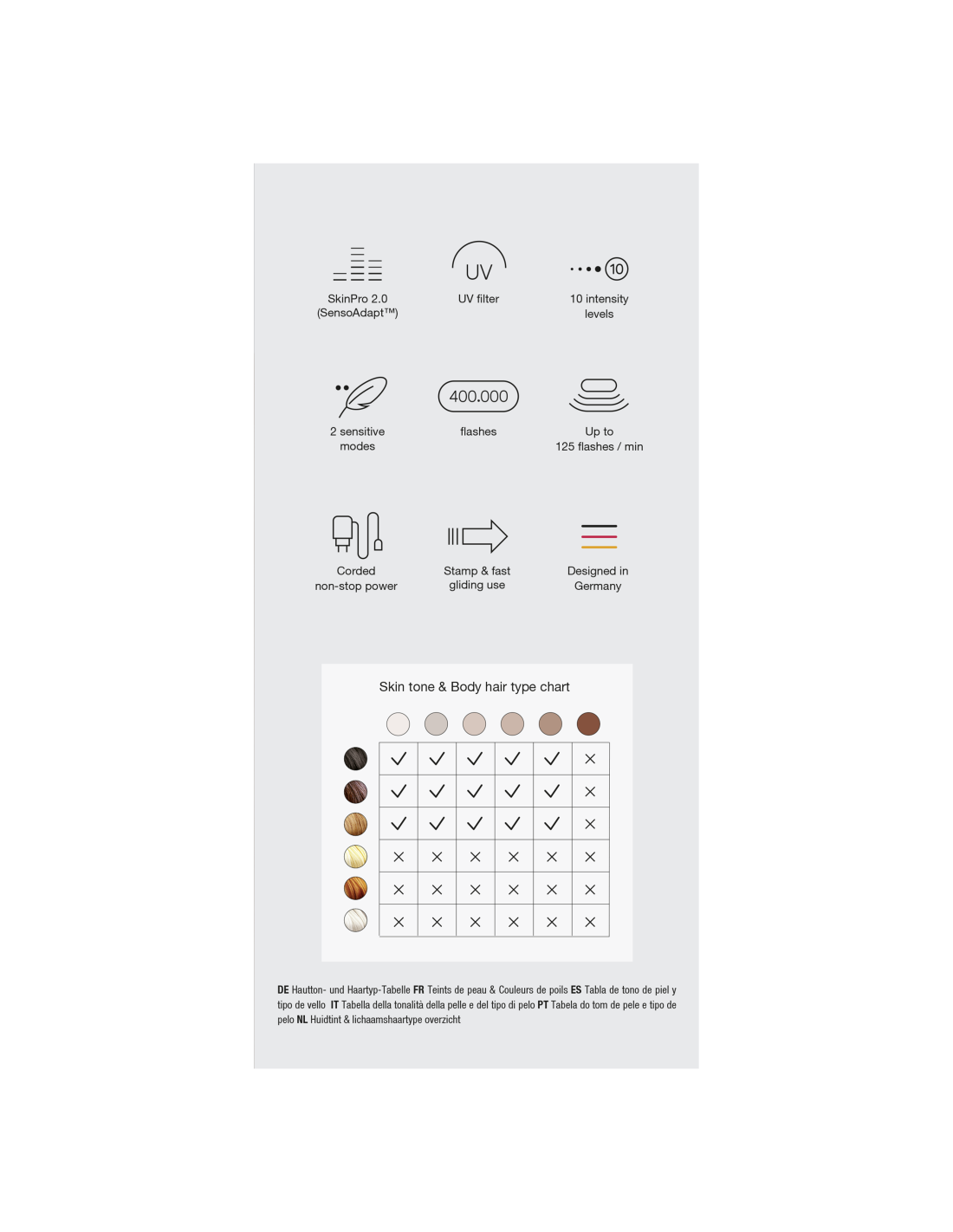 ● Optimaalne jõud iga kehaosa jaoks Skin pro 2.0 abil – salongilaadne tehnoloogia, mis kohandub automaatselt ja pidevalt teie nahatooniga.