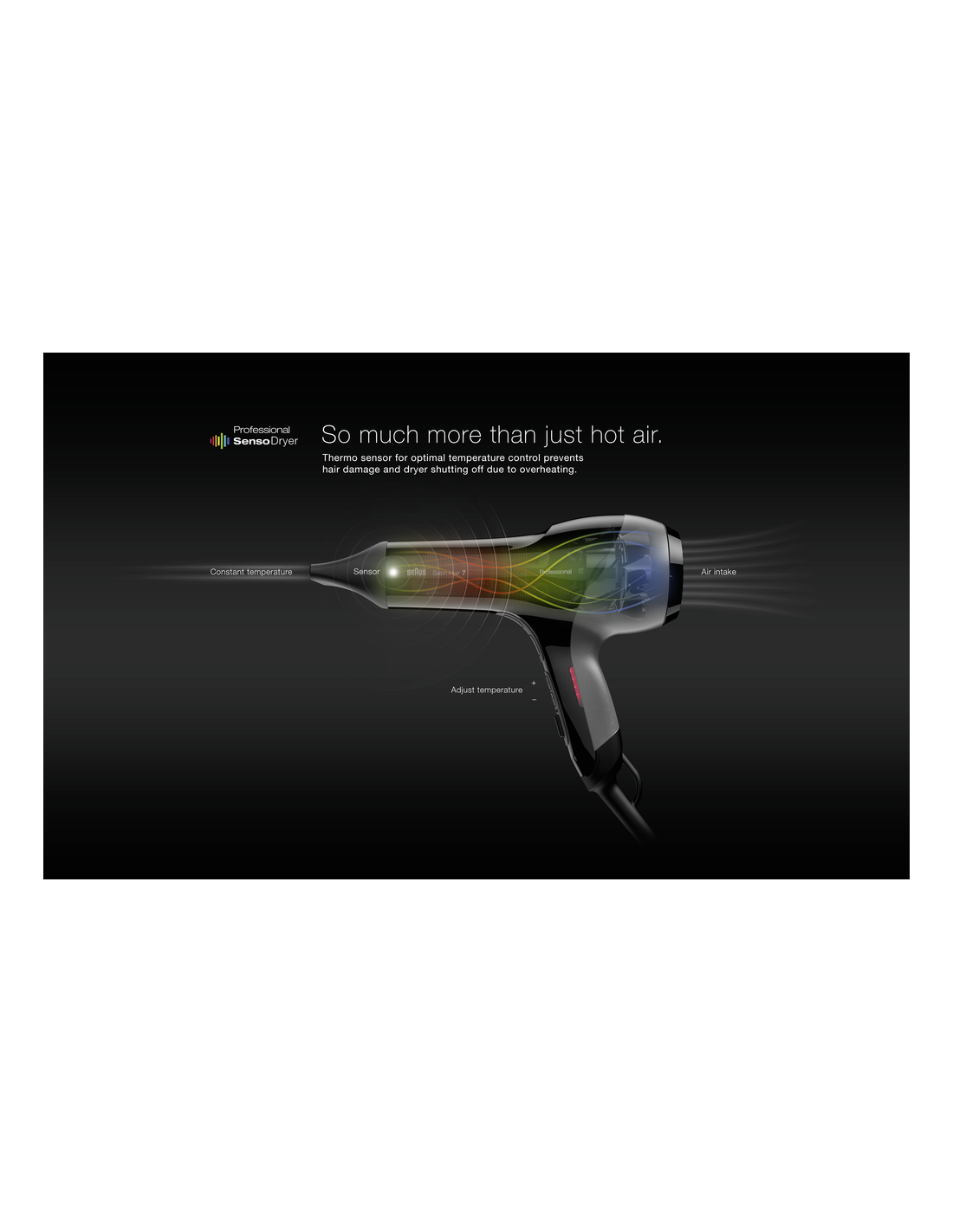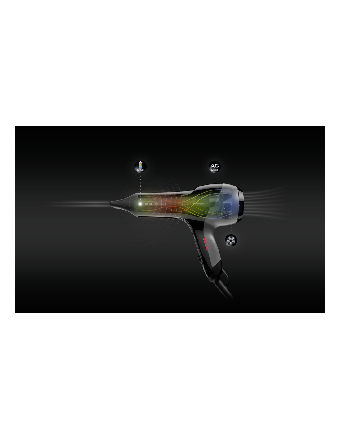 Satin-Hair 7 föön seisab ohutu stiliseerimise eest, rakendades ühtlast ja täpset kuumust ning niisutamisfunktsiooni. Temperatuuriandur mõõdab ja reguleerib pidevalt temperatuuri, et see oleks optimaalne. Professionaalne mootor tagab 5x pikema fööni eluea. Proffesionaalne ventilaatorisüsteem.