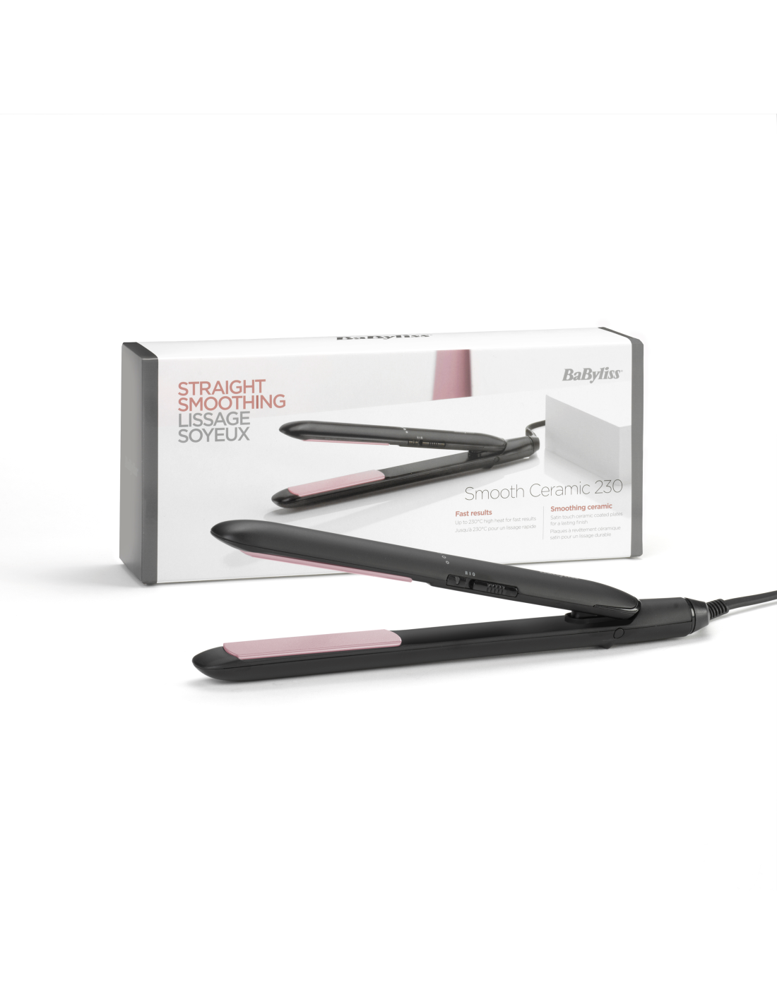 Juuksesirgendaja Smooth Ceramic 230 on atlassilise kattega, sujuvate keraamiliste plaatidega ning kahe temperatuuriseadistusega, maksimaalse temperatuuriga 230°C, et tagada lihtne ja kontrollitud soeng ja sile tulemus kõigil juuksetüüpidel.