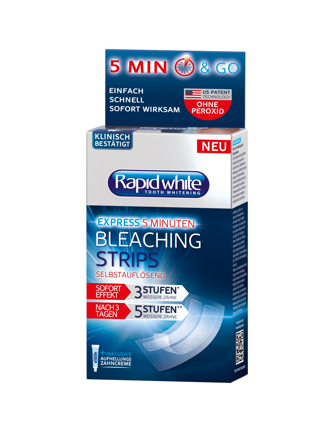 Kliiniliselt on tõestatud, et Rapid White hammaste valgendusplaastrid valgendavad hambad kuni 3 tooni* heledamaks ainult ühe kasutuskorraga ja kuni 5 tooni** heledamaks ainult 3 päevaga.