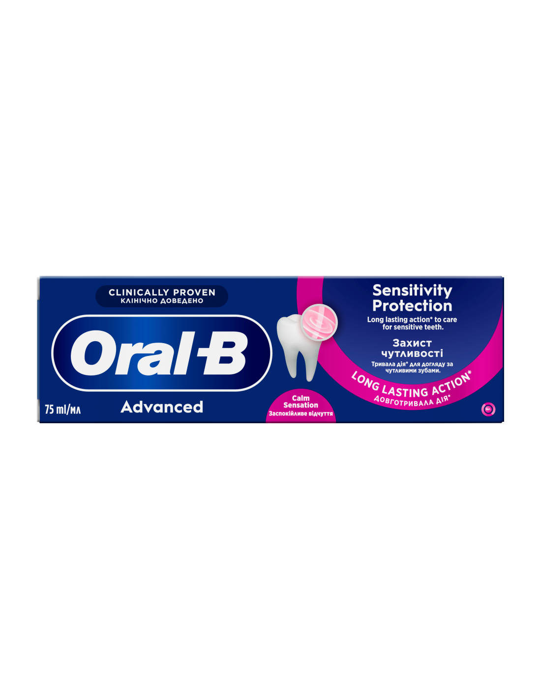 Hambapasta Oral-B Advanced Sensitivity Protection Calm Sensation on kliiniliselt tõestatud: see tagab pideval kasutamisel tundlikele hammastele kauakestva kaitse. Oral-B ainulaadne bakterivastane tehnoloogia tinafluoriidi kompleksi ja aktiivsete rahustavate ainetega loob kaitsekilbi, mis kaitseb tundlikke hambaid tõhusalt ka harjamiste vahel, pakkudes jahutavat tunnet harjamise ajal ja järel. Sobib tundlikele hammastele. Igapäevane hambapasta.