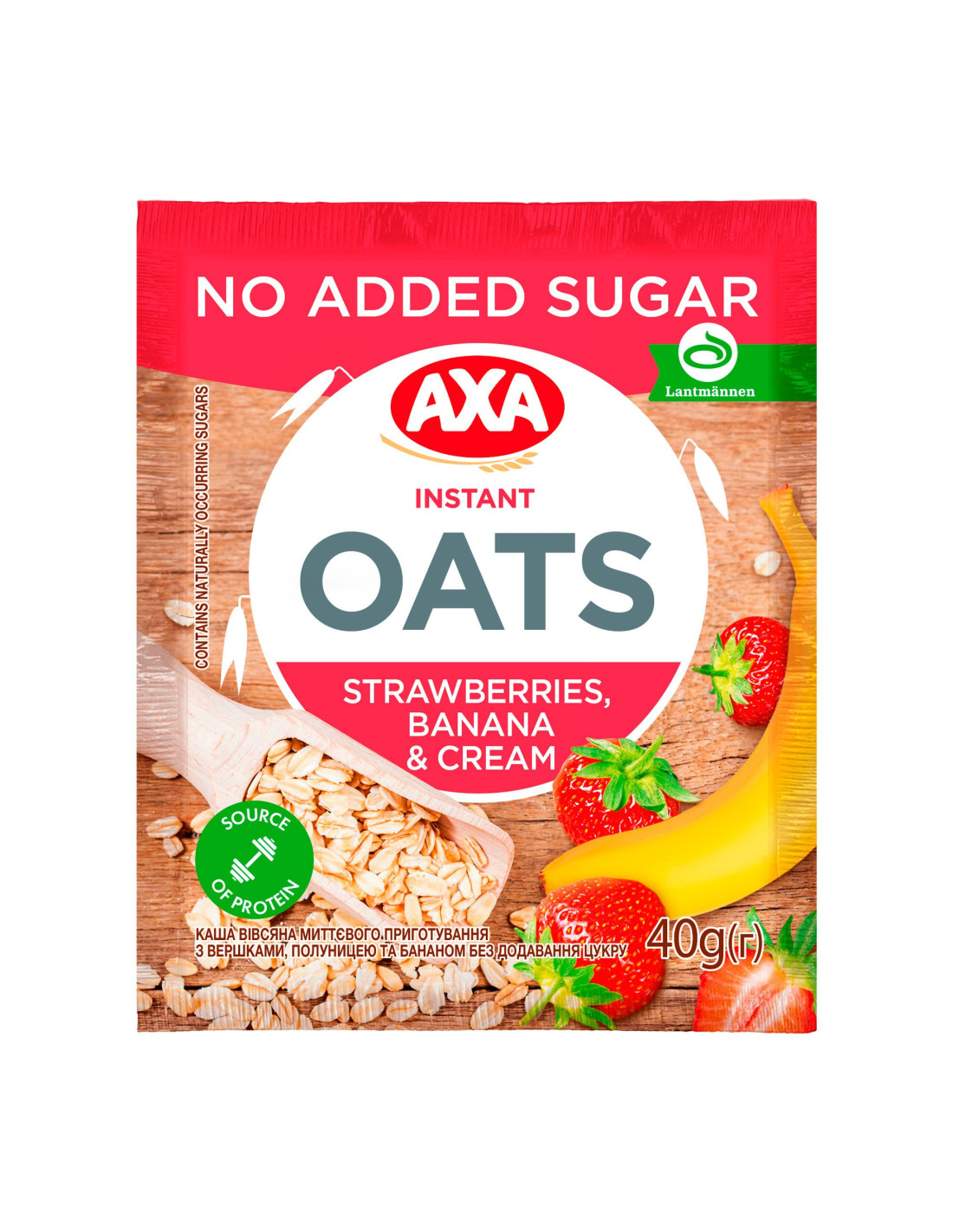Kaerahelbed 86,3%, koorepulber 10%, külmkuivatatud maasikate ja banaani segu 3%, sool, vanilli lõhna- ja maitseaine. Võib sisaldada maapähkli, nisu, pähklite ja soja jääke.