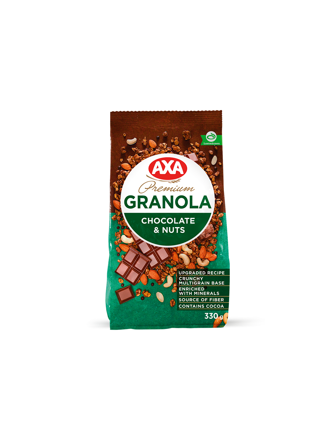 Kaerahelbed (45%), suhkur, maisihelbed (8%) (maisitangud, suhkur, sool), nisu-maisipallid (8%) (nisu, maisitangud, suhkur, sool, emulgaator sojaletsitiin (E322), päevalilleõli), päevalilleõli kõrge oleiinisisaldusega rafineeritud desodoreeritud talveks antioksüdandiga (E306), glükoos-fruktoossiirup, india pähklid (5%), kondiitritoodete mass (4%) (suhkur, taimne rasv (täielikult hüdrogeenitud palmituumaõli), vähendatud rasvasisaldusega kakaopulber, emulgaator sojaletsitiin (E322), sool, lõhna- ja maitseaine (šokolaad)), vähendatud rasvasisaldusega kakaopulber, mandlilaastud (1,0%), tumeda šokolaadi mass (0,5%) (riivitud kakao, suhkur, kakaovõi, emulgaator sojaletsitiin (E322), lõhna- ja maitseaine (vanilliin)), sool, lõhna- ja maitseiane (vanilli), mineraalide kompleks (vask, raud, mangaan, seleen, tsink, jood), E-vitamiin. Võib sisaldada maapähkli ja piimatoodete osakesi.
