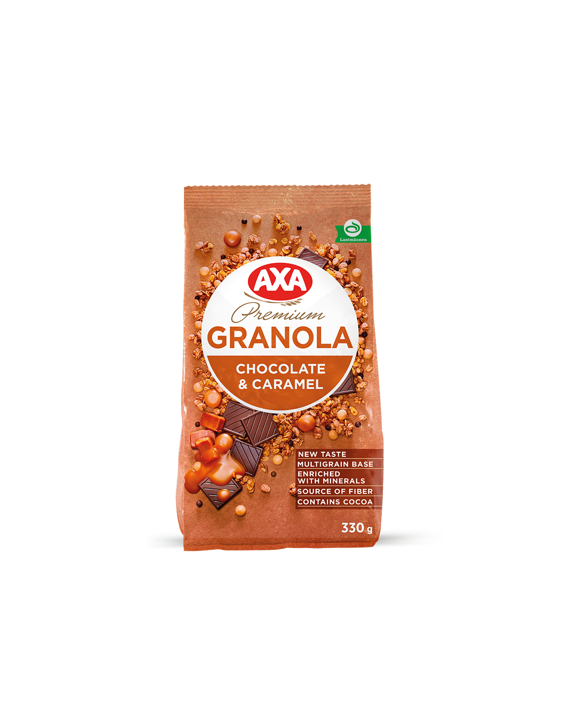Kaerahelbed (49%), suhkur, maisihelbed (8%) (maisitangud, suhkur, sool), nisu-maisipallid (8%) (nisu, maisitangud, suhkur, sool, emulgaator sojaletsitiin (E322), päevalilleõli), päevalilleõli kõrge oleiinisisaldusega rafineeritud desodoreeritud talveks antioksüdandiga (E306), glükoos-fruktoossiirup, kondiitritoodete mass (3,0%) (suhkur, taimne rasv (täielikult hüdrogeenitud palmituumaõli), vähendatud rasvasisaldusega kakaopulber, emulgaator sojaletsitiin (E322), sool, lõhna- ja maitseaine (šokolaad)), valge šokolaad karamelliga (3%) (kakaovõi, täispiimapulber, karamelliseeritud suhkur, suhkur, lõssipulber, emulgaator sojaletsitiin (E322) sool, lõhna- ja maitseaine (vanilli ekstrakt)), vähendatud rasvasisaldusega kakaopulber, tumeda šokolaadi mass (0,5%) (riivitud kakao, suhkur, kakaovõi, emulgaator sojaletsitiin (E322), lõhna- ja maitseaine (vanilliin)), sool, lõhna- ja maitseiane (soolakaramell), mineraalide kompleks (vask, raud, mangaan, seleen, tsink, jood), E-vitamiin. Võib sisaldada maapähkli ja pähkli osakesi.