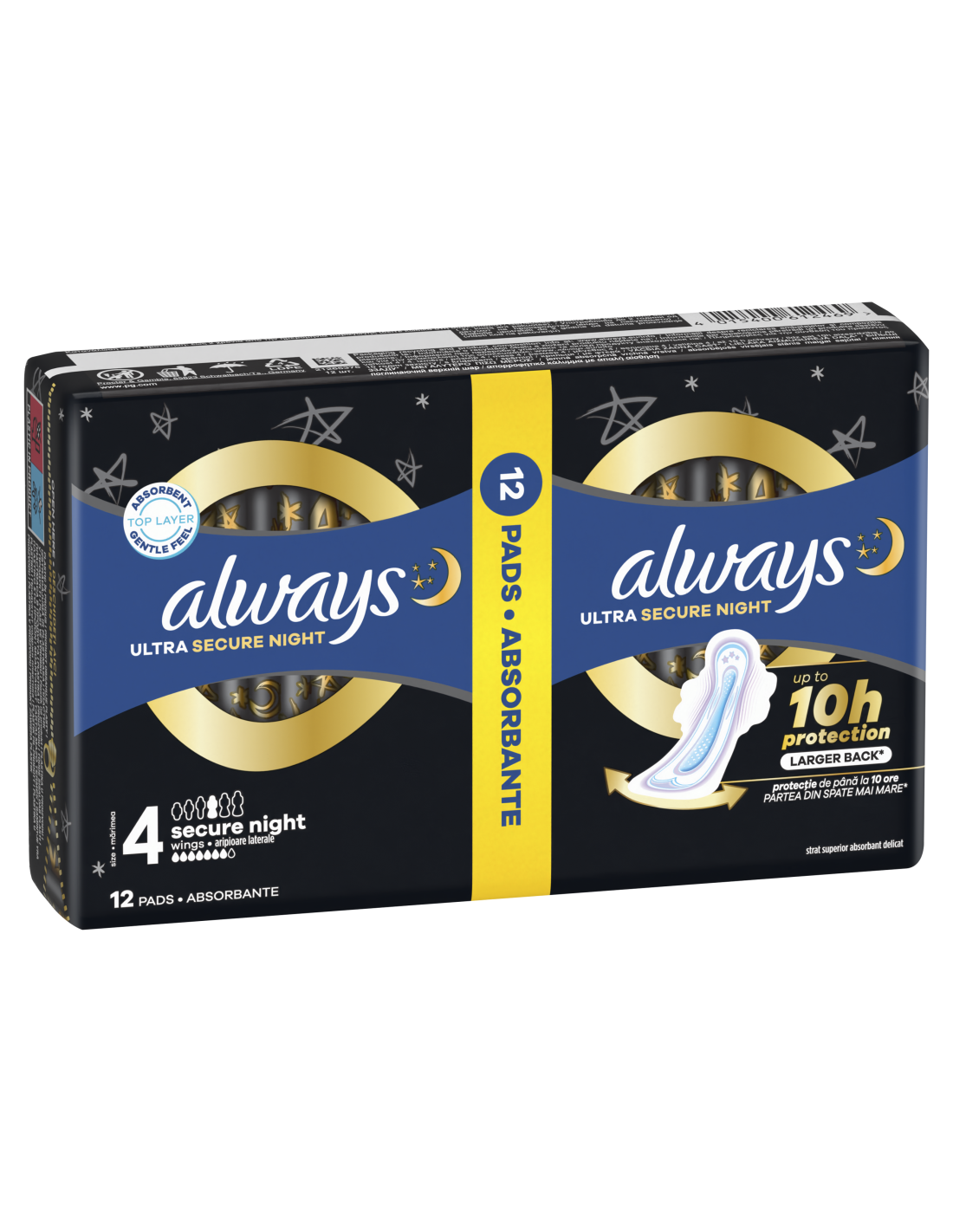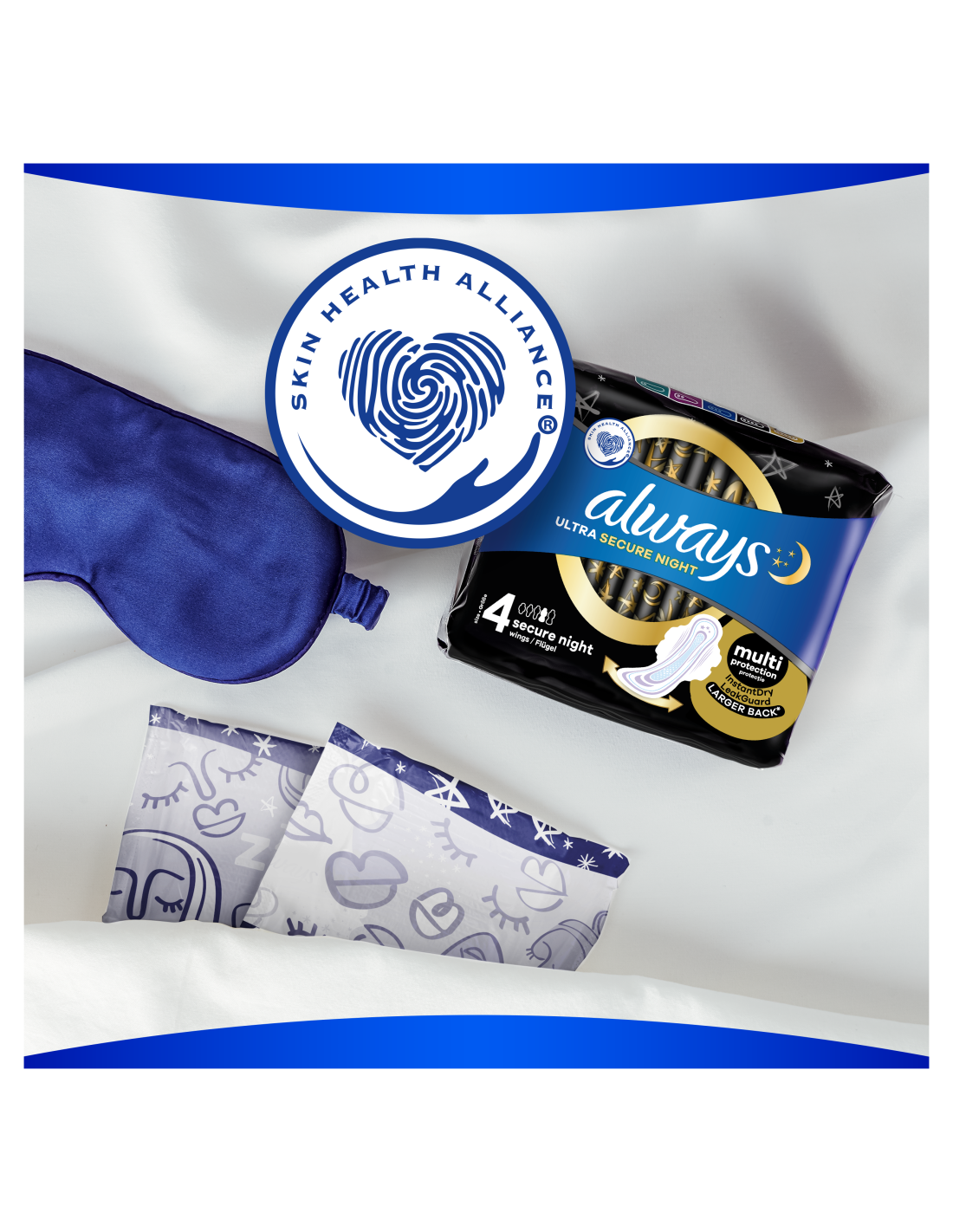 Ära lepi magades vähema kui hea unega tänu kuni 10-tunnisele kaitsele: tiivakeste ja imava õrna pealiskihiga hügieenisidemel ALWAYS Ultra Secure Night (suurus 4) on kolm kaitsvat omadust, nii et sa ei pea lekete kontrollimiseks üles ärkama ega sidet poole öö pealt välja vahetama. 60% suurem tagaosa (võrreldes hügieenisidemega Always Ultra Normal, suurus 1) ja LeakGuard-tehnoloogia lukustavad vedeliku sidemesse ning aitavad vältida menstruatsiooni ajal öiseid lekkeid ja lõhnu. Always Ultra hügieenisidemed on saanud nahatervise organisatsiooni Skin Health Alliance dermatoloogilise heakskiidu.