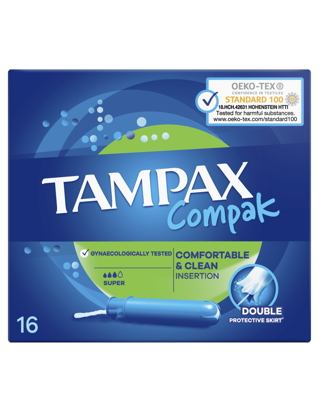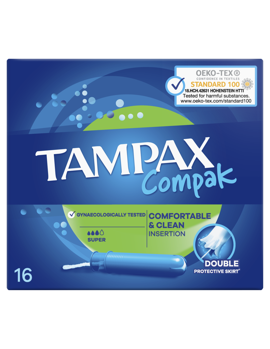 Tampoonid Tampax Compak Super pakuvad sulle diskreetset kaitset mõõduka kuni tugeva vereeritusega päevadel. Tampax Compak tampoonid pakuvad päevade ajal kaitset väga praktilisel viisil. Need ei sisalda lõhna- ega värvaineid. Tampax Compaki tampoonide juurde kuulub kompaktne plastaplikaator, millel on sujuvaks sisestamiseks ümar ots. Imavad sooned juhivad vedeliku tampooni sisemusse ja kaitsev topeltääris aitab takistada lekkimist – et sinu päevad oleksid muretud. Tampax Compaki tampoone on günekoloogiliselt testitud. Neid on Oeko-Tex Standard 100 poolt sõltumaltult katsetatud kahjulike ainete sisalduse suhtes. Kindel, leketeta kaitse võimaldab teha, mida iganes soovid. Parimad Tampax Compaki tampoonid mõõduka kuni rohke vooluse imamiseks.Proovi tampooni Tampax Pearl Compak – parimat mugavust ja kaitset Tampaxi tootevalikust.Lisateavet Tampaxi toodete kohta leiad Tampaxi veebisaidilt.