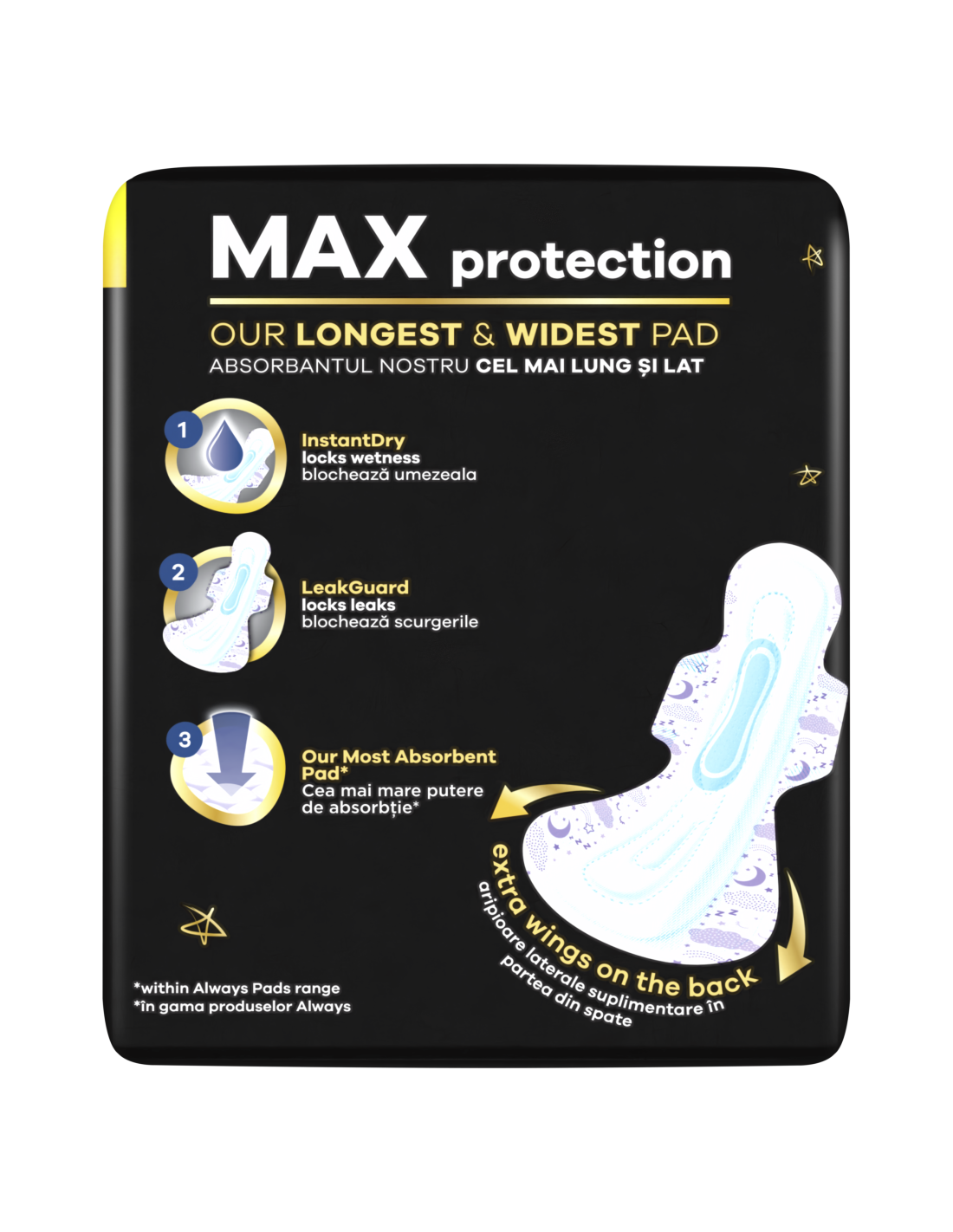 Ära lepi magades vähema kui katkematu unega: ALWAYS Ultimate Nighti tiivakestega hügieeniside (suurus 6) pakub MAKSIMAALSET KAITSET, nii et sa ei pea lekete kontrollimiseks üles ärkama ega sidet poole öö pealt välja vahetama. Meie kõige pikem ja laiem side on varustatud LeakGuard-tehnoloogia ja kõige imavama sisuga, et ennetada menstruatsiooni ajal öiseid lekkeid. InstantDry-süsteem imab vedeliku hetkega ja hoiab märguse nahast eemal. Lisaks on sidemel ComfortFit-süsteem ja tagaosas Extra-tiivakesed, mille abil püsib side paigal mis tahes magamisasendis. Leia endale sobivaim side, kasutades spetsiaalset suuruste süsteemi Always My Fit. Vooluse tugevuse ja püksikute numbri järgi leiad endale menstruatsiooni ajaks parima kaitse, mida Always pakub.