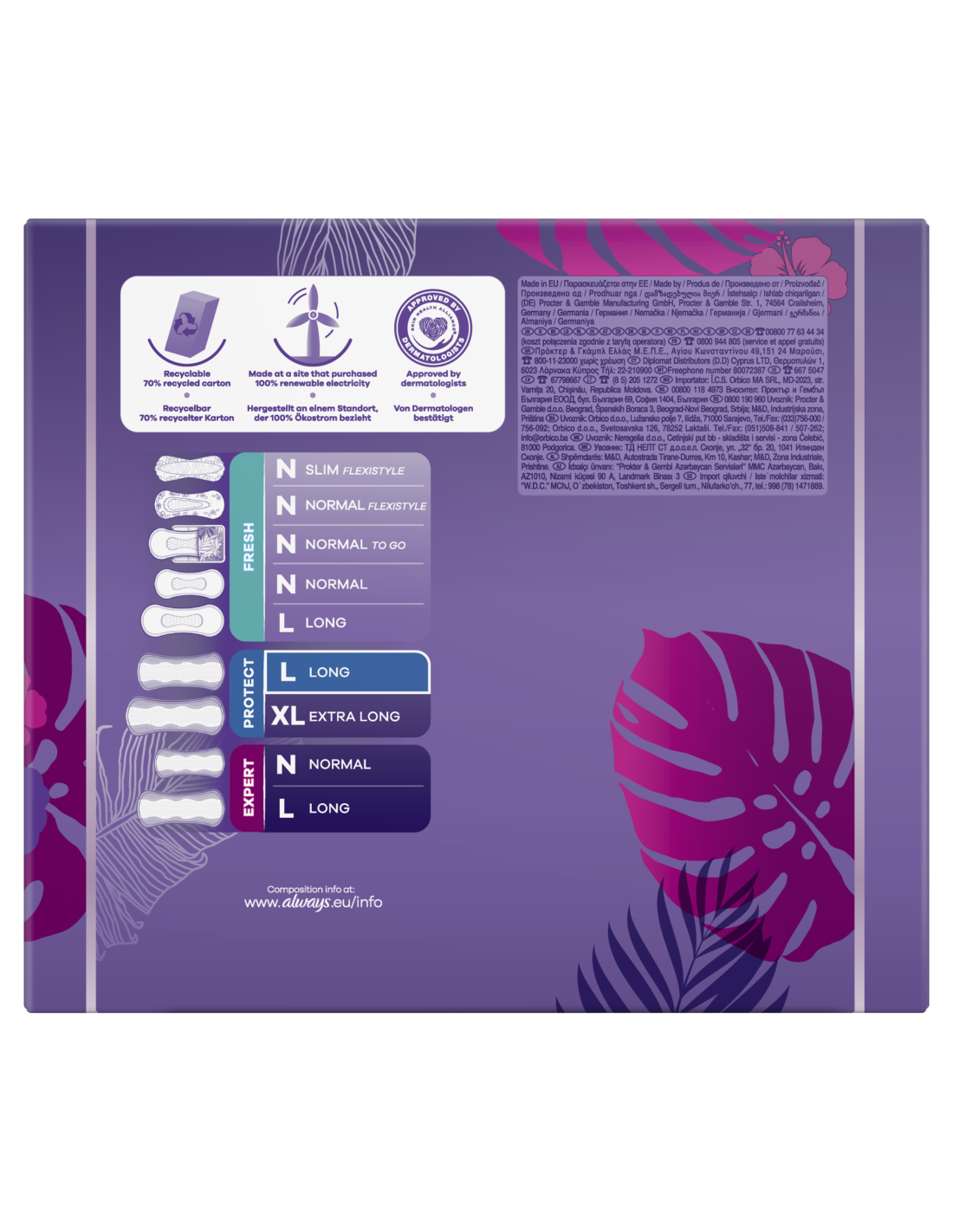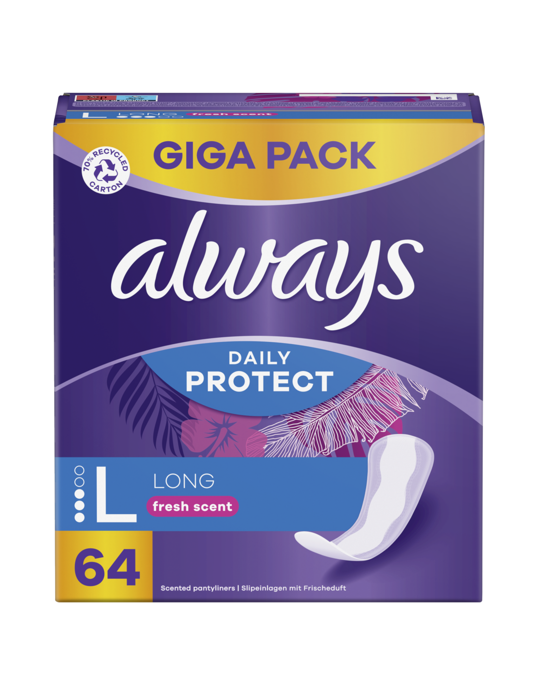 Always Daily Protecti Long pesukaitsetega oled kogu päeva jooksul kaitstud. Pesukaitsetele on lisatud pikkust ja laiust, et tagada suurem katvus, ning meie enda välja töötatud värske lillelõhn Imava ala ja külgkaitsetega pesukaitsed pakuvad igapäevast kaitset tupeeritise, ebakorrapärase või kerge menstruatsiooni ja kerge uriinipidamatuse korral. Naudi puhaste aluspükste värskusetunnet!