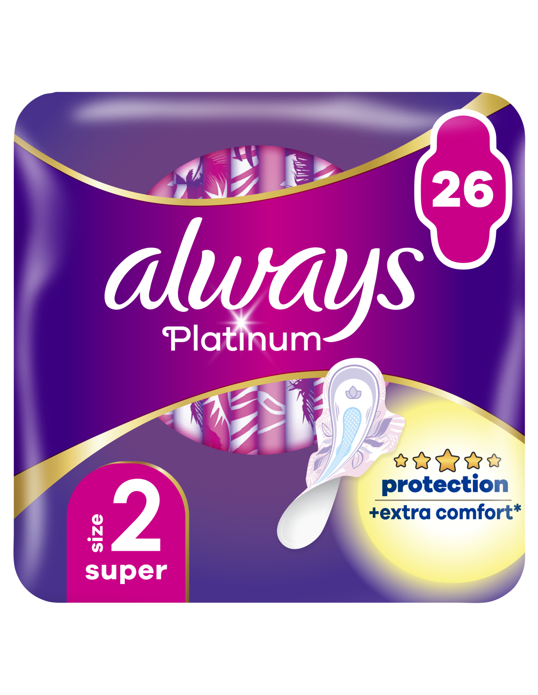 ComfortLock-tiivakestega hügieeniside Always Platinum on loodud senisest paremaks sobitumiseks*, et ennetada lekkeid, sideme nihkumist ja ebamugavustunnet. Kui kasutad hügieenisidet Always Platinum, pole sul üldse vaja päevade peale mõelda. Tiivakestega hügieenisidet Always Platinum Super (suurus 2) soovitame päevaseks kasutamiseks keskmise vereerituse korral. Proovi hügieenisidet Always Platinum Secure Night (suurus 4), Always Platinumi parimat hügieenisidet öiseks kaitseks. * võrreldes eelmise tootega