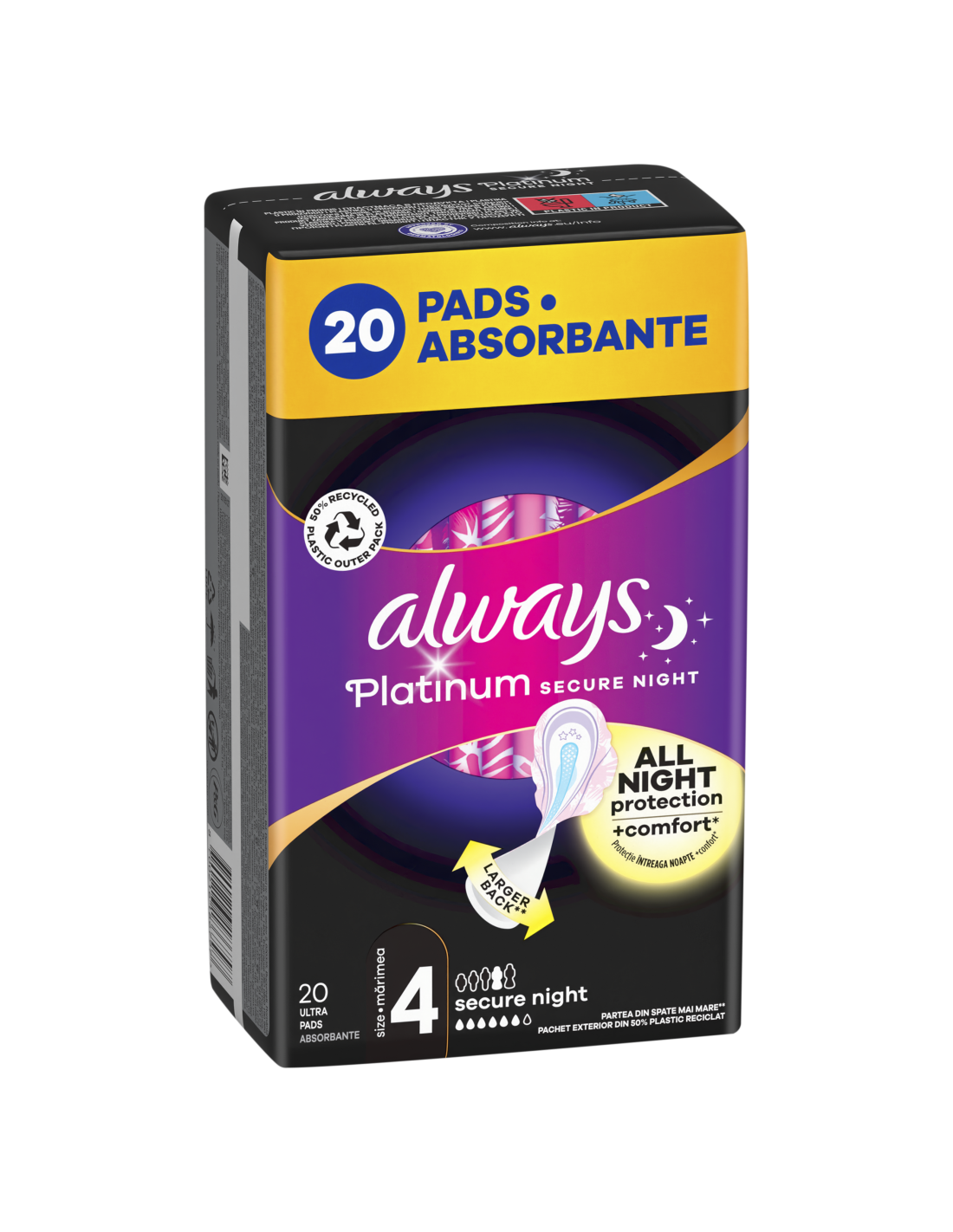 Hügieeniside Always Platinum on loodud senisest paremaks sobitumiseks*, et ennetada lekkeid, sideme nihkumist ja ebamugavustunnet. Hügieenisidemega Always Platinum võid muretult edasi unistada. Always Platinum Secure Nighti sidemel (suurus 4) on 60%* võrra suurem tagaosa, mis tagab parema kaitse seal, kus vajad seda kõige rohkem. * võrreldes hügieenisidemega Always Platinum Normal (suurus 1).