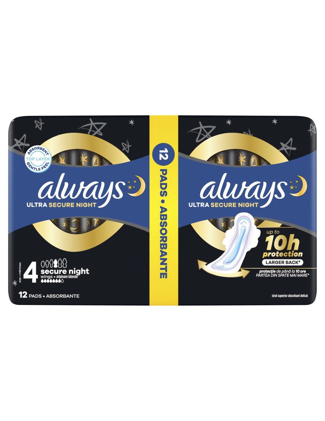 Ära lepi magades vähema kui hea unega tänu kuni 10-tunnisele kaitsele: tiivakeste ja imava õrna pealiskihiga hügieenisidemel ALWAYS Ultra Secure Night (suurus 4) on kolm kaitsvat omadust, nii et sa ei pea lekete kontrollimiseks üles ärkama ega sidet poole öö pealt välja vahetama. 60% suurem tagaosa (võrreldes hügieenisidemega Always Ultra Normal, suurus 1) ja LeakGuard-tehnoloogia lukustavad vedeliku sidemesse ning aitavad vältida menstruatsiooni ajal öiseid lekkeid ja lõhnu. Always Ultra hügieenisidemed on saanud nahatervise organisatsiooni Skin Health Alliance dermatoloogilise heakskiidu.