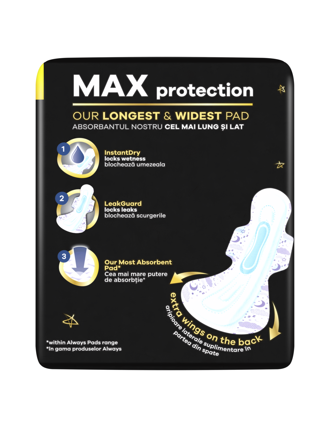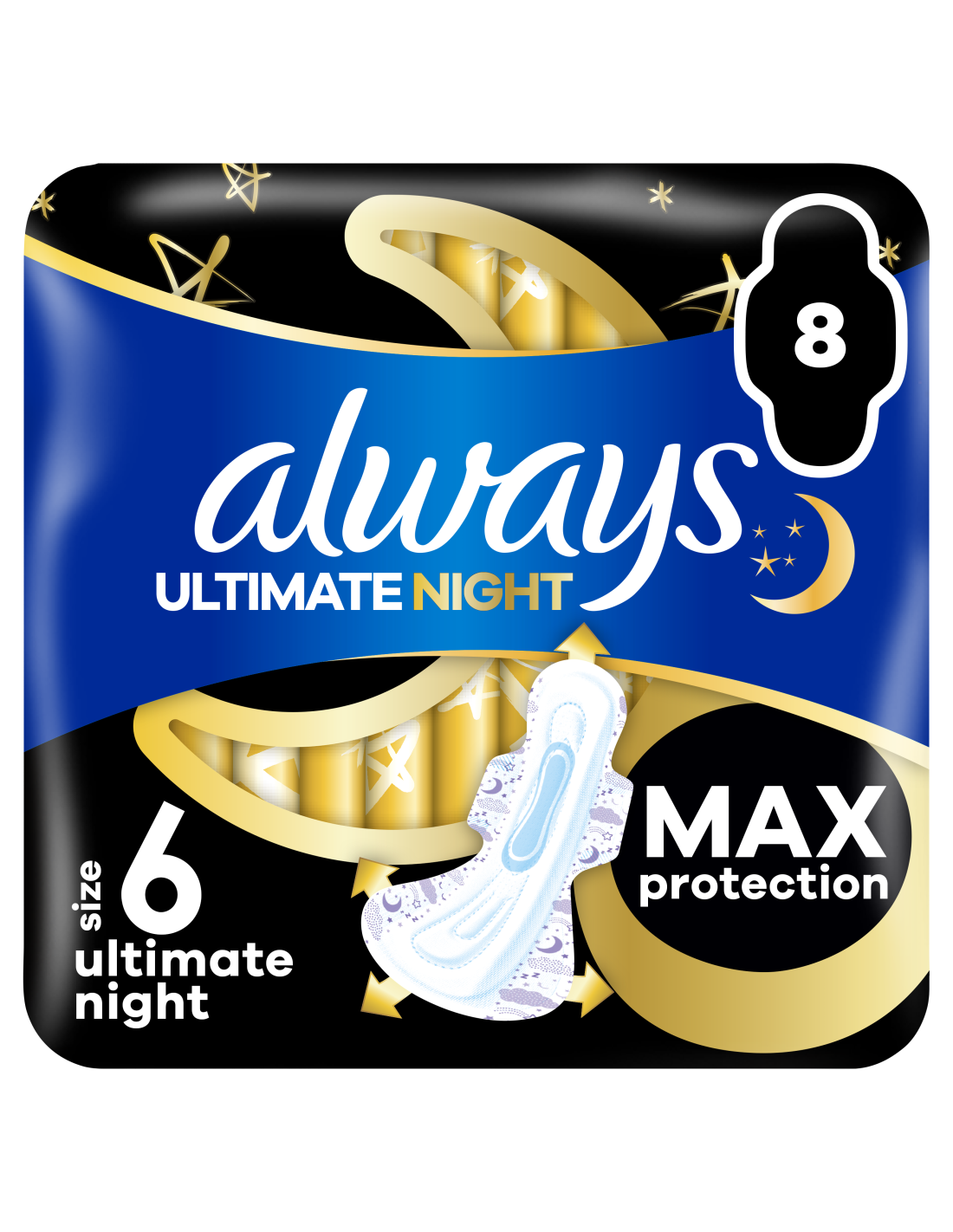 Ära lepi magades vähema kui katkematu unega: ALWAYS Ultimate Nighti tiivakestega hügieeniside (suurus 6) pakub MAKSIMAALSET KAITSET, nii et sa ei pea lekete kontrollimiseks üles ärkama ega sidet poole öö pealt välja vahetama. Meie kõige pikem ja laiem side on varustatud LeakGuard-tehnoloogia ja kõige imavama sisuga, et ennetada menstruatsiooni ajal öiseid lekkeid. InstantDry-süsteem imab vedeliku hetkega ja hoiab märguse nahast eemal. Lisaks on sidemel ComfortFit-süsteem ja tagaosas Extra-tiivakesed, mille abil püsib side paigal mis tahes magamisasendis. Leia endale sobivaim side, kasutades spetsiaalset suuruste süsteemi Always My Fit. Vooluse tugevuse ja püksikute numbri järgi leiad endale menstruatsiooni ajaks parima kaitse, mida Always pakub.