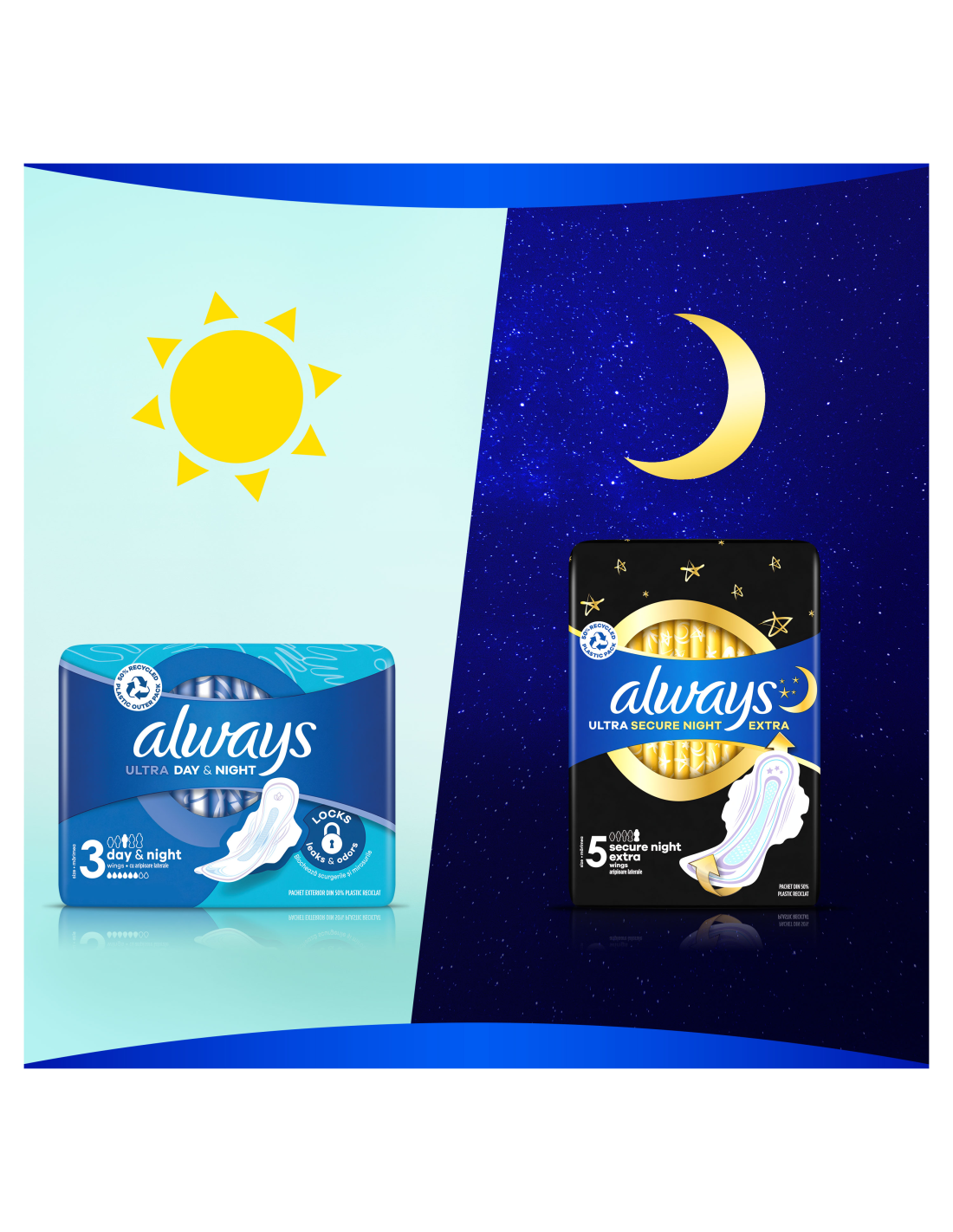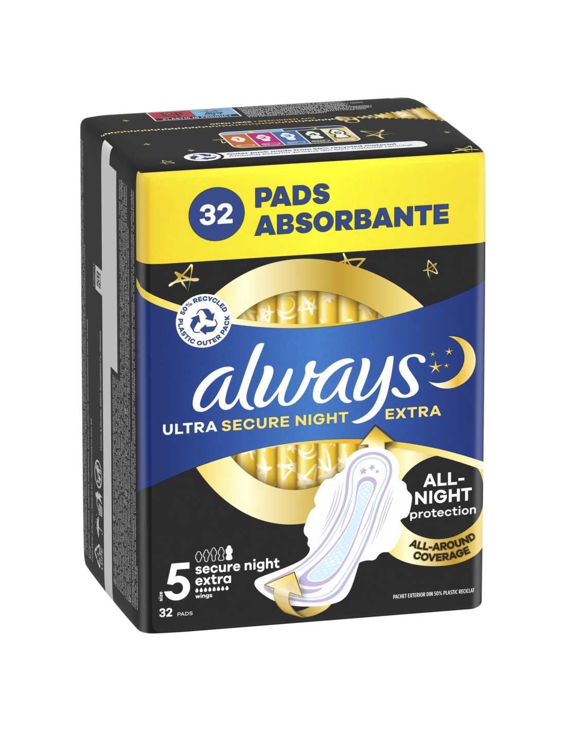 ALWAYS Ultra Secure Night Extra (suurus 5) tiibadega hügieenisidemed aitavad sul häirimatult magada. Neil on kolm kaitsvat omadust, nii et sa ei pea lekete kontrollimiseks üles ärkama ega sidet poole öö pealt välja vahetama. 9% suurem esiosa ja 85% suurem tagaosa* koos LeakGuard-tehnoloogiaga tagavad menstruatsiooni ajal täieliku öise kaitse lekete vastu. InstantDry-süsteem imab vedeliku hetkega ja hoiab niiskuse nahast eemal. Side on varustatud lisaks OdourLock-tehnoloogiaga, mis neutraliseerib ebameeldiva lõhna ja laseb sul tunda end värske ja puhtana. Maga rahulikult, sest ALWAYS Ultra pakub sulle sel ajal kolmekordset kaitset.  Skin Health Alliance’i dermatoloogiline heakskiit. Leia endale sobivaim side, kasutades spetsiaalset suuruste süsteemi Always My Fit. Vooluse tugevuse ja püksikute numbri järgi leiad endale menstruatsiooni ajaks parima kaitse, mida Always pakub.