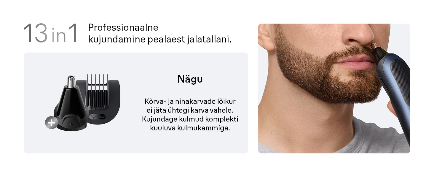 - Nägu Kõrva- ja ninakarvade lõikur ei jäta ühtegi karva vahele. Kujundage kulmud komplekti kuuluva kulmukammiga