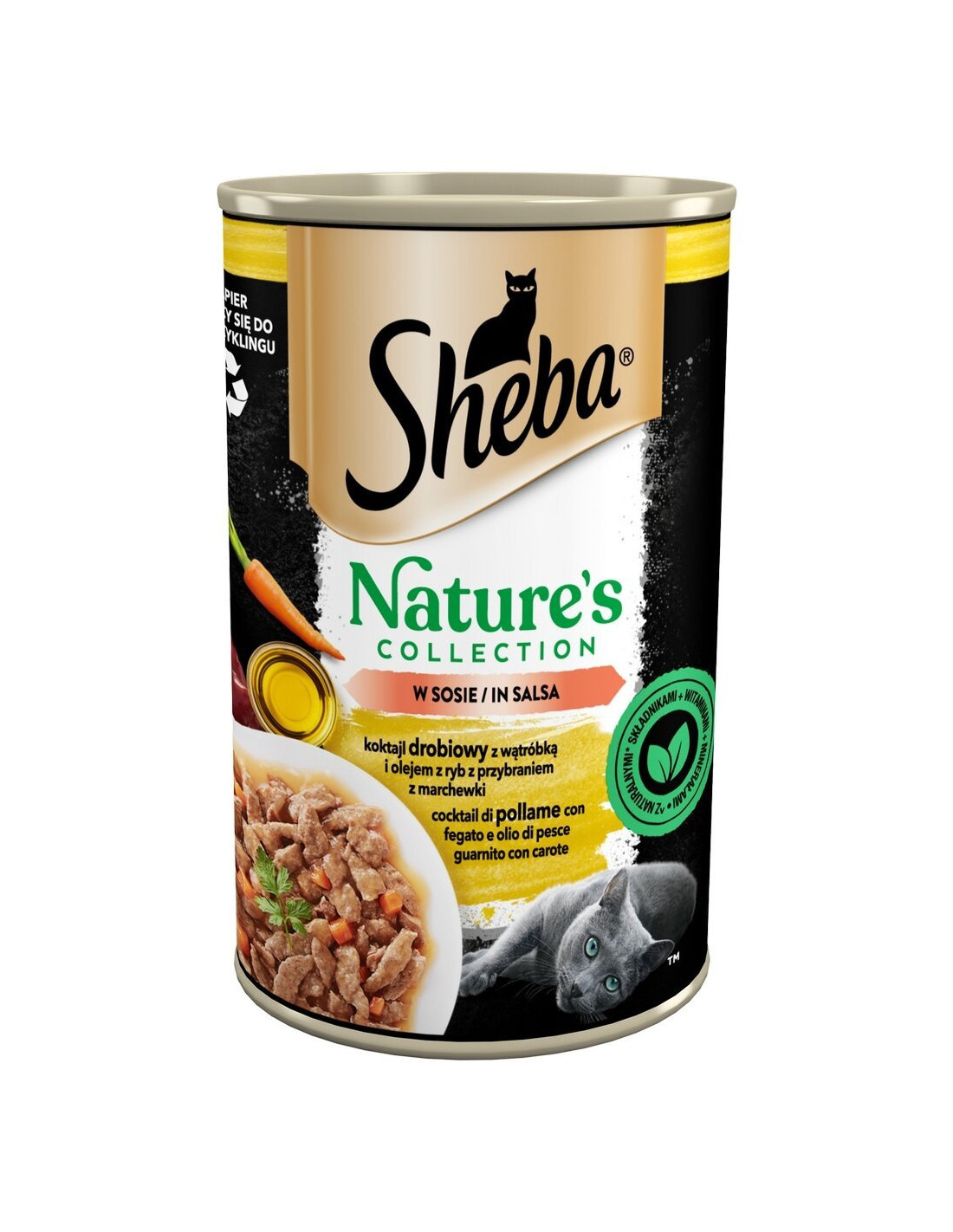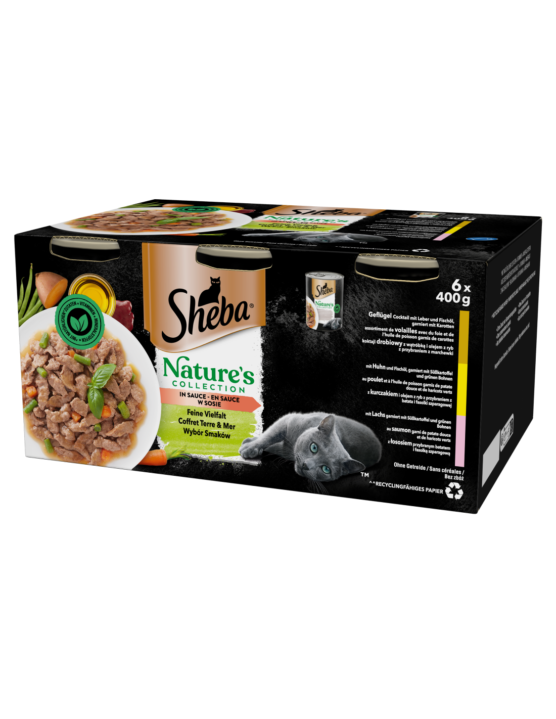 Sheba Nature's Collection'i retsepti saladus peitub hoolikalt valitud kõrge kvaliteediga looduslikes koostisosades, vitamiinides ja mineraalides. SHEBA® Nature's Collection sisaldab kalaõli, mis on looduslik Omega-3 rasvhapete allikas. Maguskartul ja rohelised oad on looduslikud kiudainete, B-vitamiinide ja kaaliumi allikad, ning porgandid pakuvad antioksüdante ja kiudaineid. Need maitsvad toidud ei sisalda teravilja, kunstlikke maitseaineid ega värvaineid.