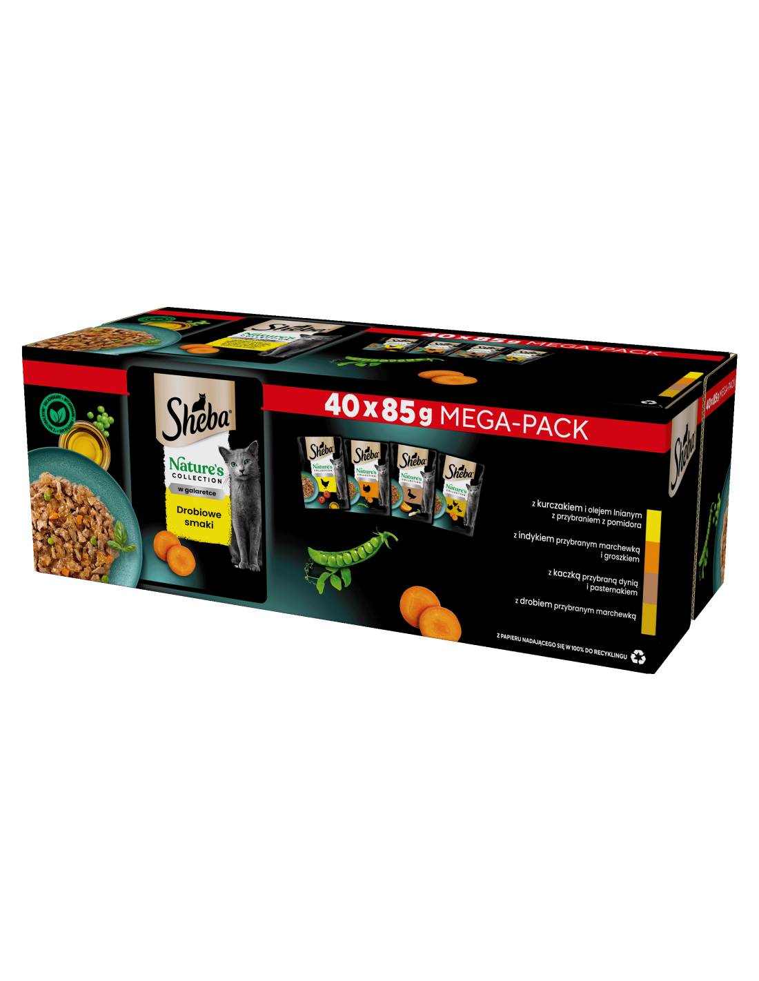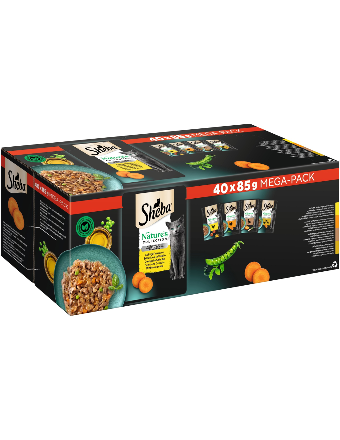 Sheba® Nature's Collection Linnulihamaitsed on hoolikalt valitud, õrnade tükkide segu aroomikas tarretises. Eine on neljas maitses: tükid kanaga ja linaseemneõliga tomatitega garneeringus, kalkuniga, mis on garneeritud porgandite ja hernestega, pardiga, mis on garneeritud kõrvitsa ja pastinaagiga, ning linnulihaga, mis on garneeritud porgandiga – rõõmustavad ka kõige nõudlikumaid kasse.