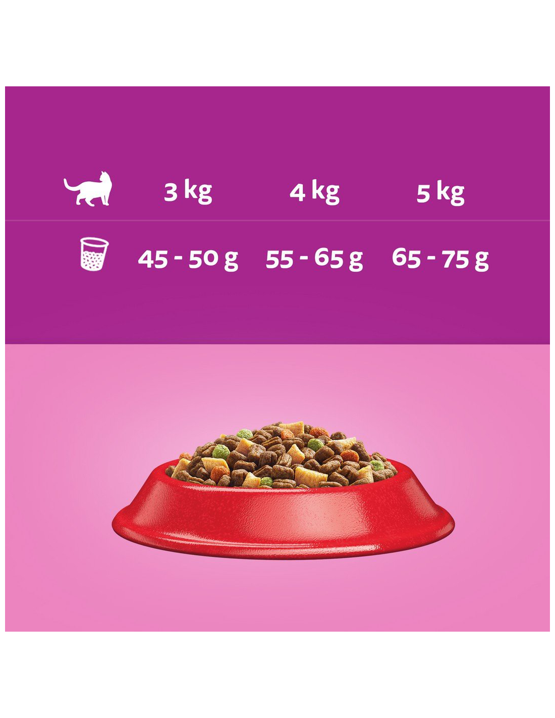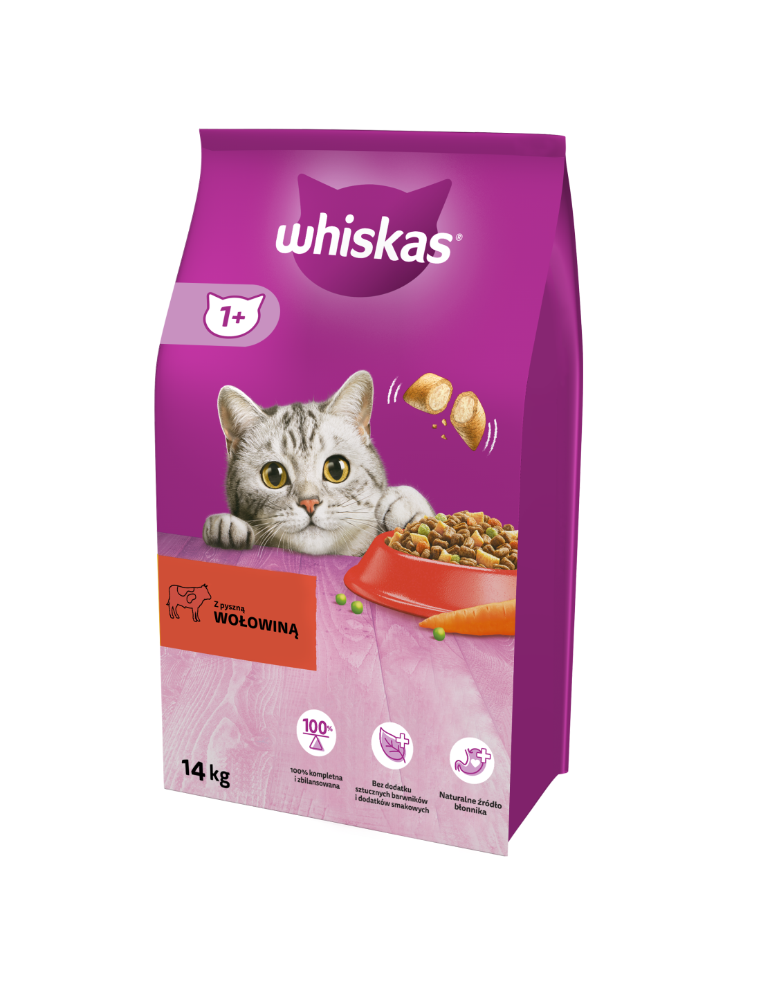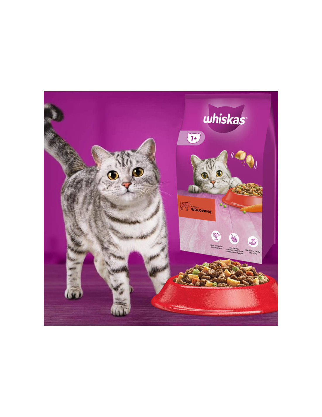 Maitsva veiselihaga WHISKAS on täisväärtuslik kuivtoit, mille osakesed on pealt krõbedad ja seest õrna täidisega, mida kassid armastavad. Kvaliteetsed valgugraanulid on hoolikalt koostatud, et anda teie kassist sõbrale kõik, mida ta nurrumiseks vajab.