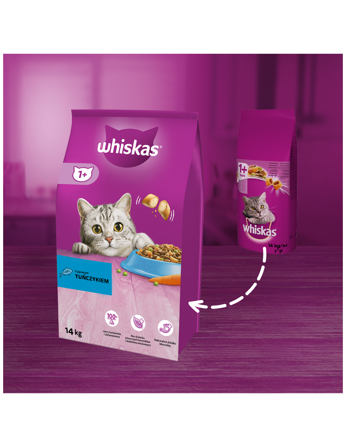 15 g kuivtoitu võib asendada 1 kotikese 85 g WHISKAS® märgtoiduga.