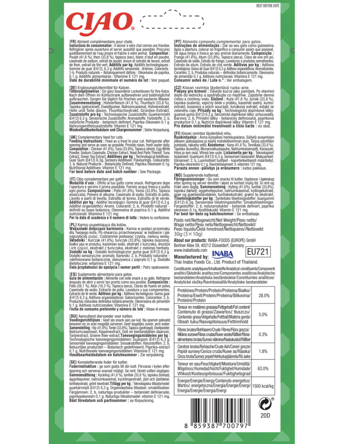 Koostisosad: kana (41,6%), tuunikala (33,8%), tapiokk (kuivatatud), munavalgepulber, naatriumkaseinaat, kanaekstrakt, pärmiekstrakt, tuunikalaekstrakt, rohelise tee ekstrakt.