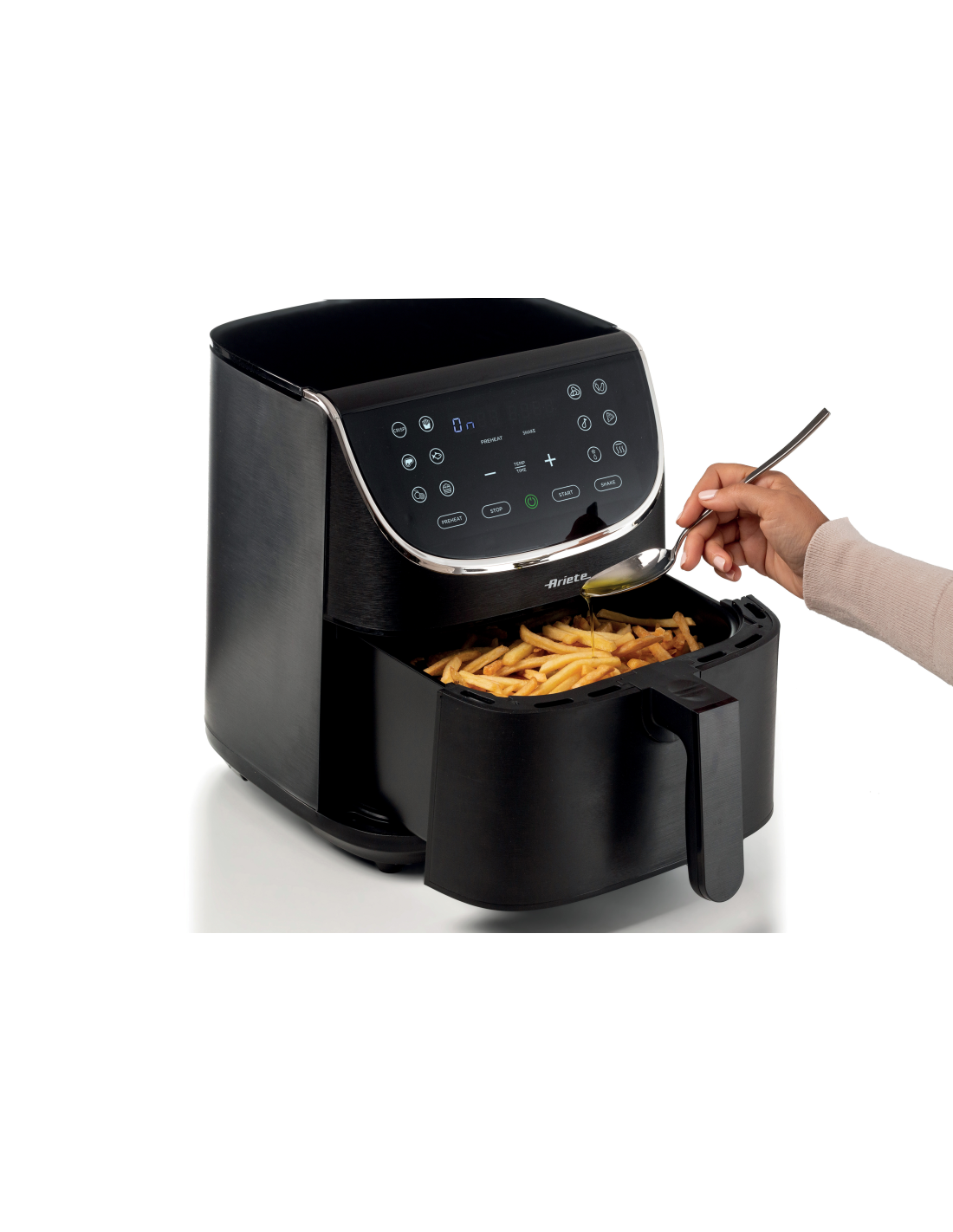 Airy Fryer 7L on kuumaõhufritüür, millega saate valmistada kõike suures koguses ning vaja läheb vaid supilusikatäit õli – tervislik ja maitsev. Ariete Airy Fryer 7L suur 7-liitrine nõu võimaldab korraga valmistada kuni 2,8 kg friikartuleid! Ja mitte ainult friikartuleid - ka kroketeid, kala, liha ja paljusid paneeritud toite, nii sügavkülmutatud kui ka tooreid ja värskelt paneeritud – seda kõike tänu 12 eelseadistatud programmile.