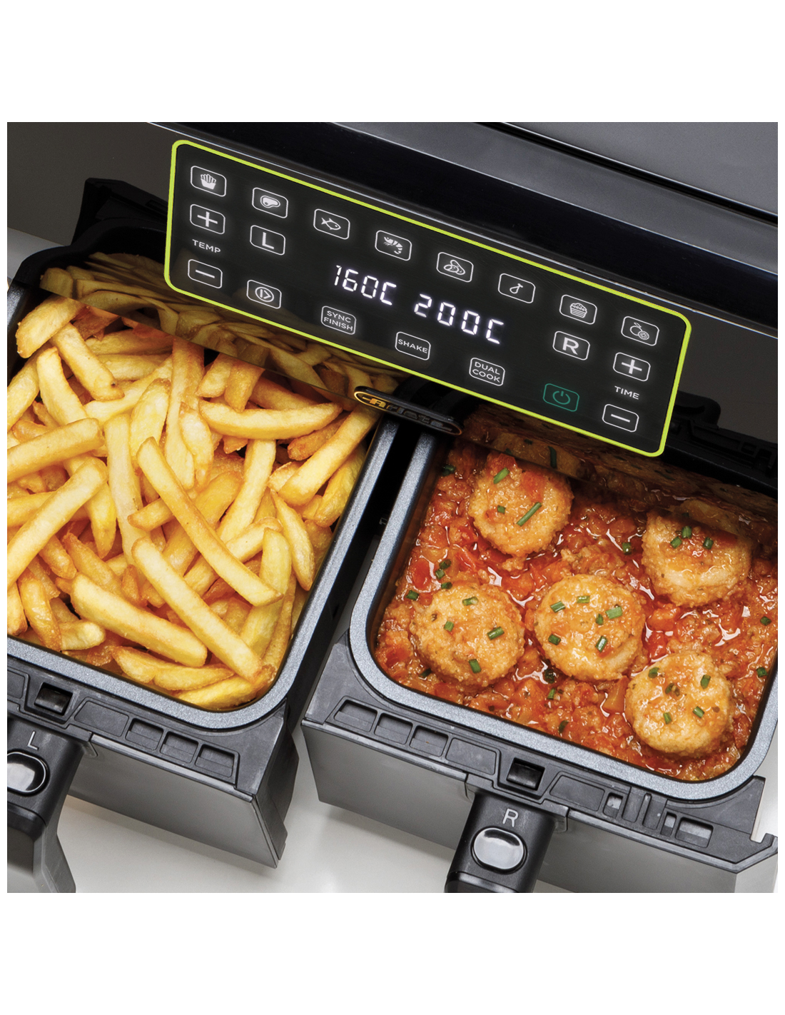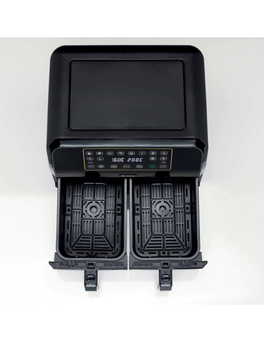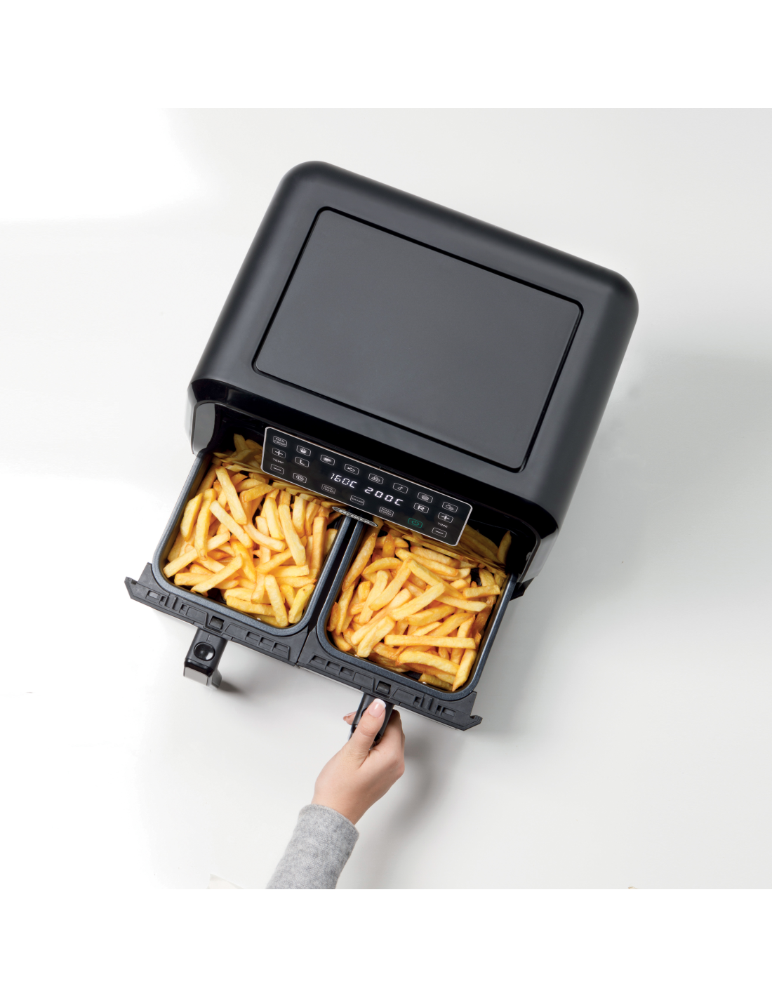 Airy Fryer Dual õhufritüüri on lihtne puhastada tänu eemaldatavatele mittenakkuvatele korvidele ja selle keskkonnamõju on väike, kuna see ei tekita õlijäätmeid, mis on üks kõige raskemini kõrvaldatavaid jäätmeid ringluses.