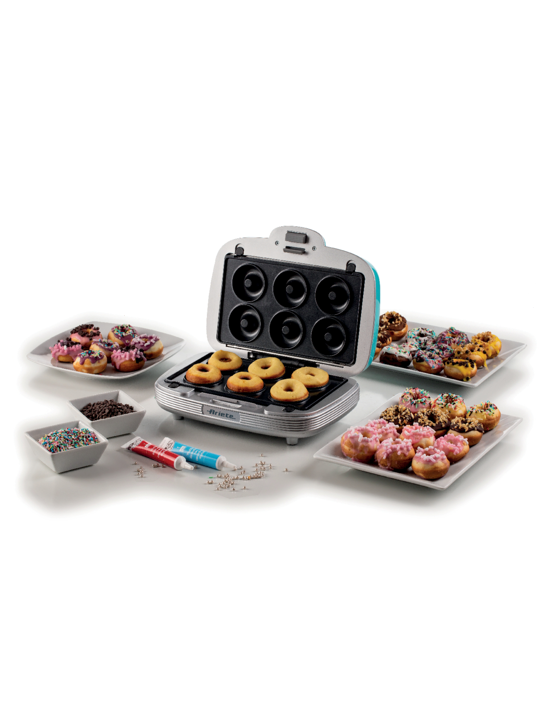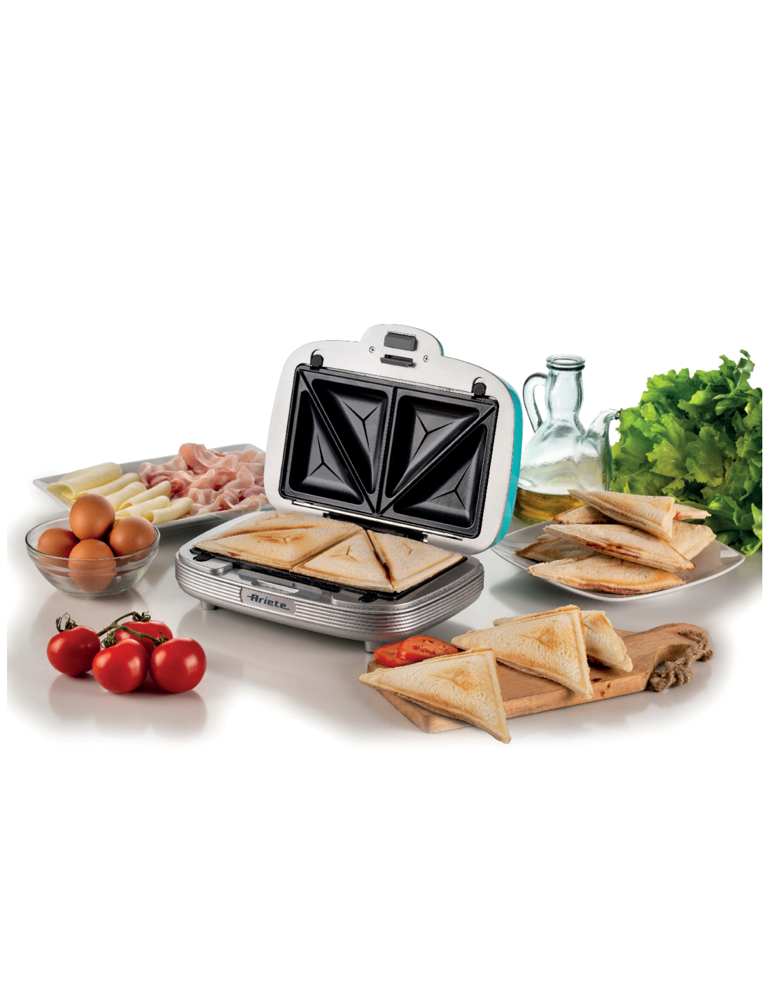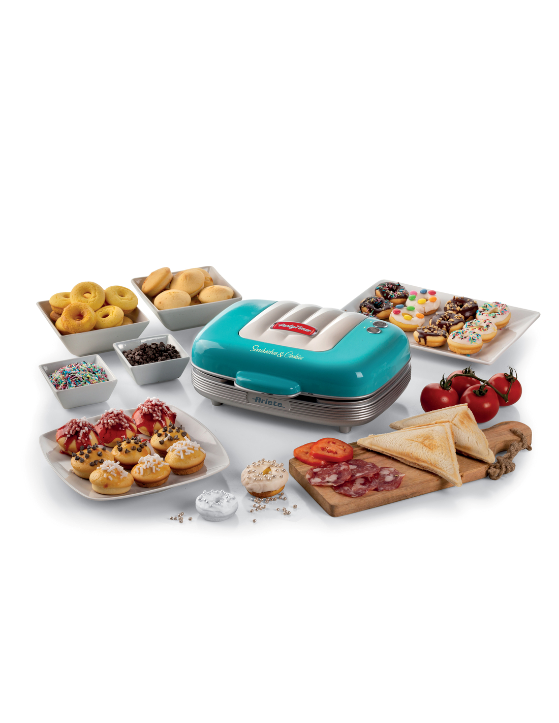 Multifunktsionaalne küpseti muffinide, sõõrikute ja võileibade valmistamiseks, unikaalse 50ndate Ameerika söögikoha disainiga. Ideaalne nii magusate kui ka soolaste suupistete lõbusaks valmistamiseks. Let’s party koos Party Time Arietega! Peo, vahepala või erilise päeva jaoks – saad valmistada rikkaliku laua head-paremat täis! Maitsvad muffinid, vastupandamatud sõõrikud ja täidetud võileivad. Üks lihtne ja kiire toode, millel on 3 mittenakkuvat, eemaldatavat ja vahetatavat plaati. Lõbutse köögis ja valmista palju maitsvat!