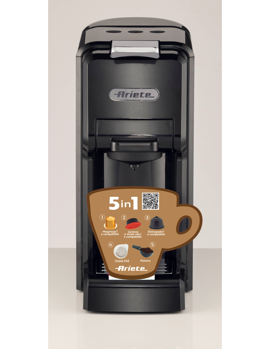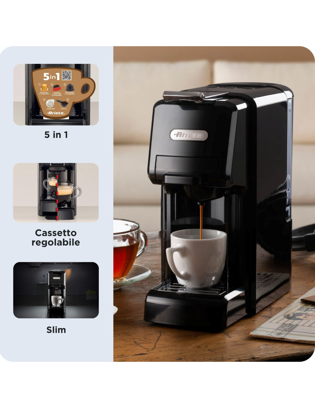 Espressomasin vahetatavate sahtlitega 5-in-1: kapslid, ESE-padjad ja jahvatatud kohv. Õhuke ja kompaktne disain. 0,7 L veepaak. 1350 W. Espresso ja pikk kohv.
