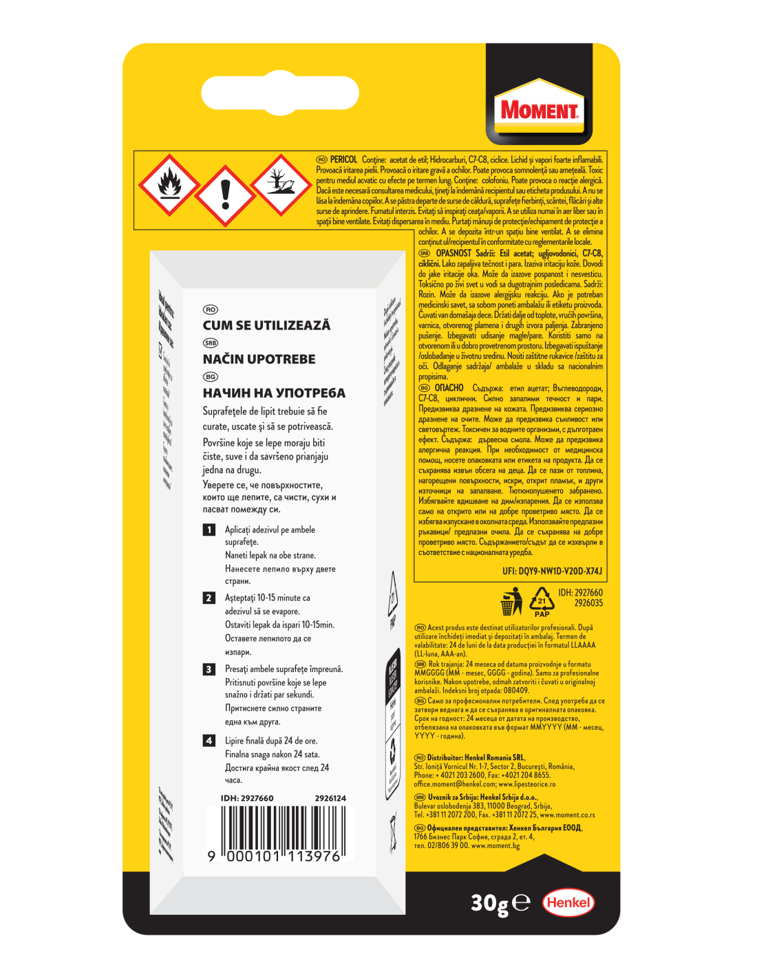Pealekandmine: Kandke Moment vedelat kontaktliimi sakilise spaatli või lühikeste harjastega pintsliga rohkelt ja ühtlaselt mõlemale liimitavale pinnale, eriti äärtele. Enne poolte kokkuliimimist laske lahustitel aurustuda. Aurustumise aeg toatemperatuuril (18–25 °C) on umbes 10–15 minutit. Tagage pidev tuulutus. Pärast aurustumisaja lõppu on liimimine võimalik kuni 2 tunni jooksul. Liiga lühikese aurustumisaja korral, eriti mitteimavate materjalide puhul, võib esialgne nakketugevus olla väiksem. Pärast lahustite aurustumist peab pinnale jääma nähtav katkematu liimikiht. Väga imavatele või suurte pooridega materjalidele võib olla vajalik kanda mitu liimikihti. Enne liimimist peab liim olema katsudes kuiv. See ei tohi jääda sõrme külge ega tekitada „niite“.