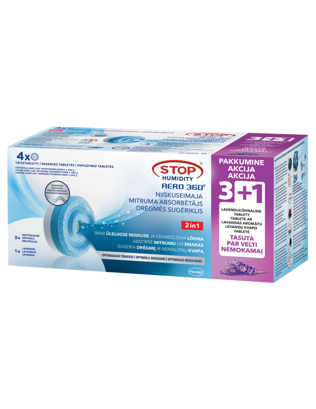 Niiskuseimaja AERO 360° üliimaval täitetabletil on õhuga paremaks kokkupuuteks ja süsteemi tõhusamaks toimimiseks uus täiustatud laineline kuju ja keskel asuv avaus, mis muudavad AERO 360° niiskuseimaja kuni 40% tõhusamaks.*