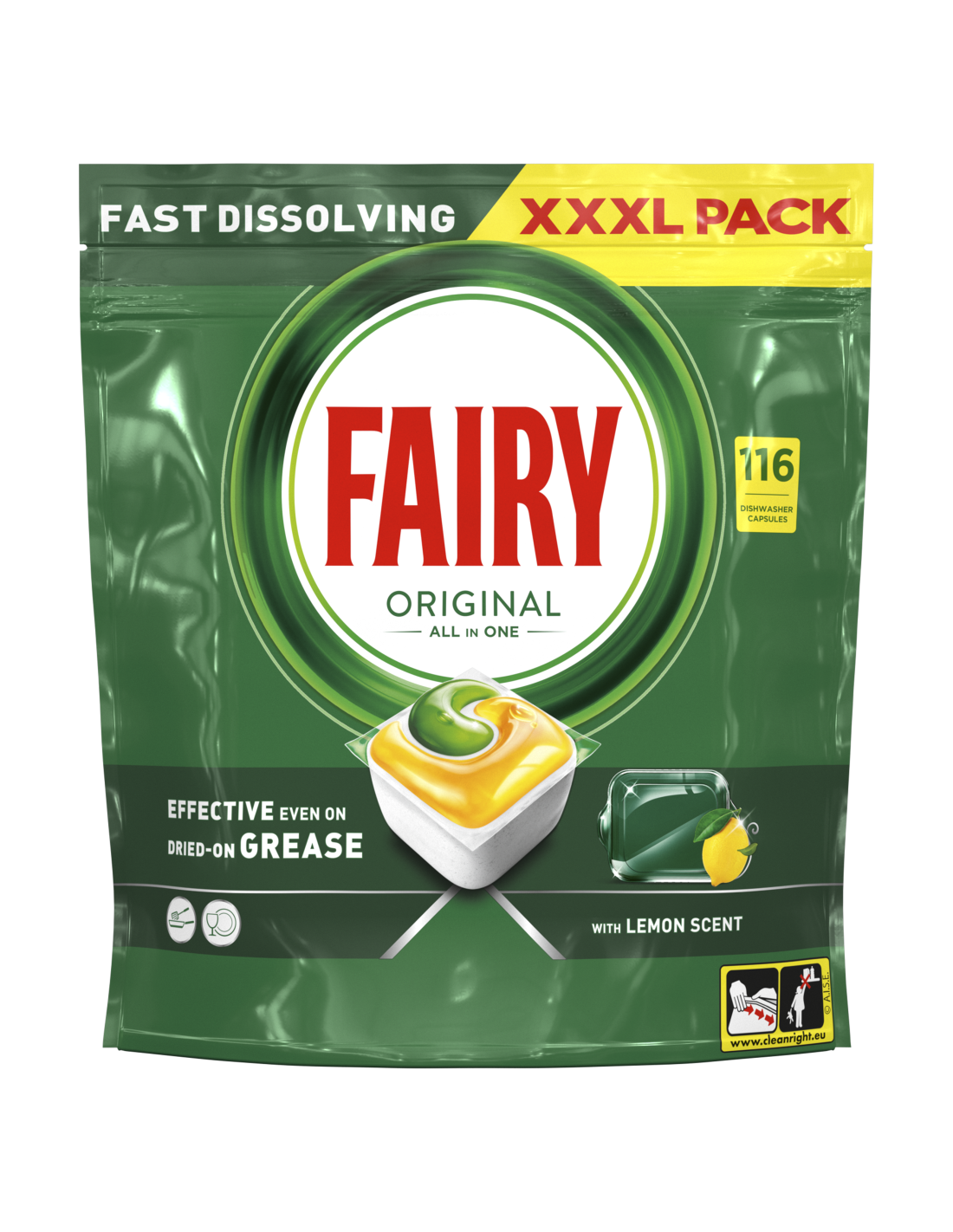 Fairy Original All in One’i nõudepesumasina tabletid pesevad nõud esimese korraga ning on tõhusad isegi kuivanud rasva korral, muutes sinu nõud säravalt puhtaks. Fairy ühendab vedeliku ja pulbri üheks võimsaks kapsliks. Selle ülilahustuv kott lahustub kiirelt nii, et see hakkab töö lõpuleviimiseks kiirelt puhastama. Ja neid on nii lihtne kasutada. Lahtipakkimine pole vajalik, pane need lihtsalt nõudepesumasina pesuaine dosaatorisse.
