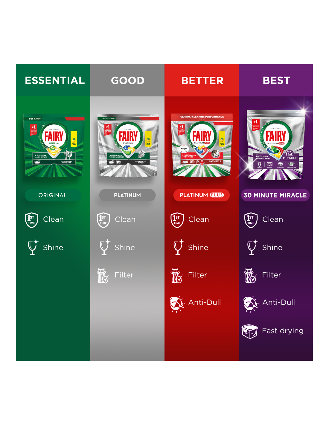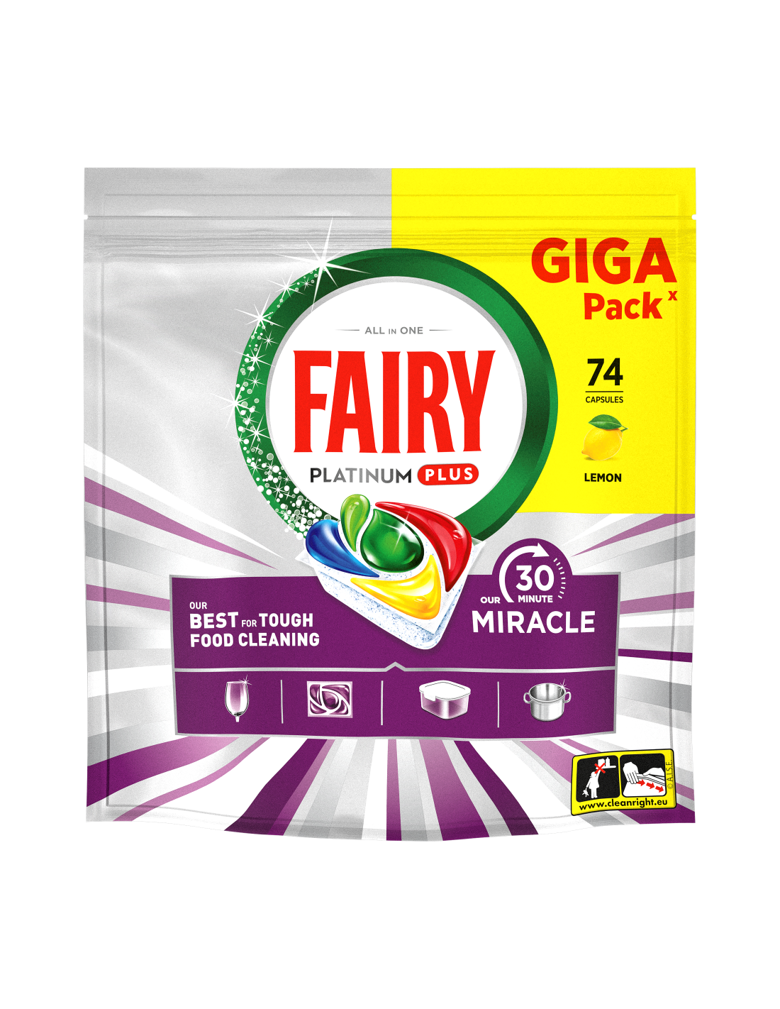 SINU IMELINE KÕIK-ÜHES LAHENDUS LIHTSALT SÄRAVATEKS NÕUDEKS. Avasta Fairy Our 30 Minute Miracle Platinum Plus, meie Nr 1 lahendus tõrksate toidujääkide eemaldamiseks. Need imelised kõik-ühes nõudepesumasina tabletid saavutavad vaevata laitmatu tulemuse isegi lühima pesutsükliga ja jätavad nõudele kerge sidrunilõhna. Viie geeli tõhusus annab säravpuhtad nõud, superläike, kiire kuivamise, rasvase filtri puhastamise ja Tuhmumisvastase Tehnoloogia. Selle kolmekordse toimega rasvaeemaldusained (võrreldes tootega Fairy Original All-in-One)  eemaldavad tõrksad toidujäägid kõigest 30 minutiga. Fairy toimib nii pika kui ka lühikese pesutsükliga juba esimesel korral ning eelpesu või järelpesu pole vajalik. Just nagu Fairy nõudepesuvedelik, kuid mugava tableti kujul. Need nõudepesumasina tabletid kõrvaldavad vajaduse kasutada nõudepesumasina soola või nõudepesumasina loputusvahendit. Sobib suurepäraselt hõivatud kodudesse ning pakub kiiret ja laitmatut puhastust, millel on üleöö leotamise toime. Koge Imet ja tervita säravaid tulemusi Fairy 5-kordse puhastusvõimsusega.