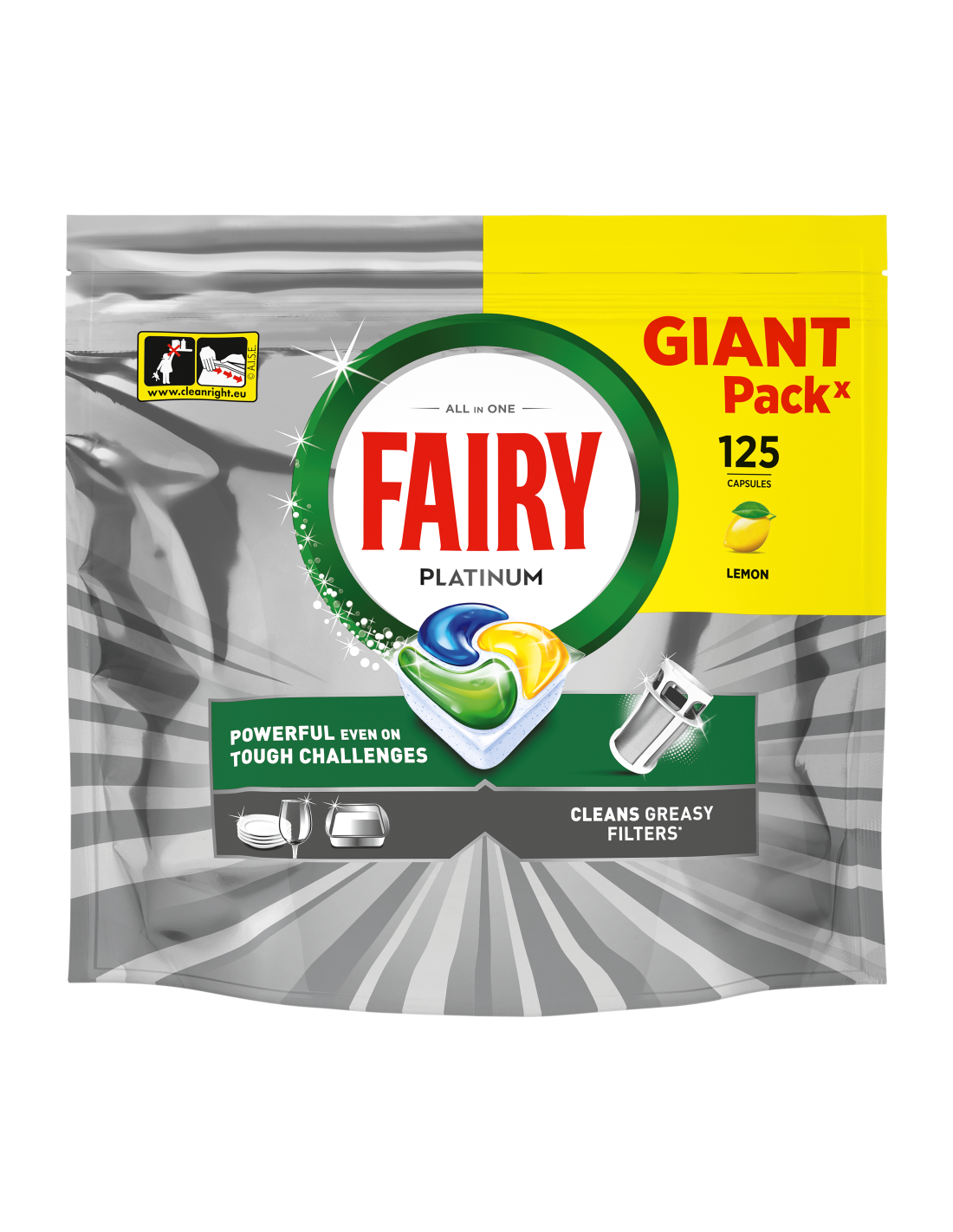 SAAVUTA ÜLIM PUHTUS ISEGI RASKESTI EEMALDATAVATE JÄÄKIDE KORRAL. Nõudepesumasina tablettidega Fairy Platinum All in One saad hakkama oma keeruliste puhastusprobleemidega – sinu lahendus puhtamate nõude ja säravama masina nimel (võrreldes Fairy Originaliga). Need on võimsad isegi raskete puhastusprobleemide korral, nagu kuivanud rasv ja põhjakõrbenud toit, jättes nõud ja filtri säravalt puhtaks. Just nagu Fairy nõudepesuvedelik, kuid mugava nõudepesumasina tableti kujul. Fairy Platinumi ülilahustuv kott lahustub kiiresti ja alustab kohe tööd, et tagada võimas puhastus. Nõudepesumasina tabletid ühendavad vedeliku ja pulbri, pakkudes mugavat kasutamist ja erakordset puhastust. Koge plekkideta läiget ja puhast, värskelt lõhnavat nõudepesumasinat. Nende nõudepesumasina tablettide kasutamine on uskumatult lihtne – need pakuvad sisseehitatud nõudepesumasina soola ja nõudepesumasina loputusvahendi toimet. Sisesta kapsel doseerimissahtlisse ning sulge kohe. Käsitse ainult kuivade kätega. Ära eemalda kapslilt pakendit ega tee sellesse torkeid. Sulge kott pärast iga kasutuskorda.