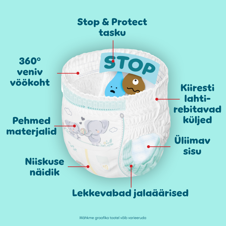 - Kaitsetasku Stop & Protect aitab vältida lekkeid mähkme tagaosas.