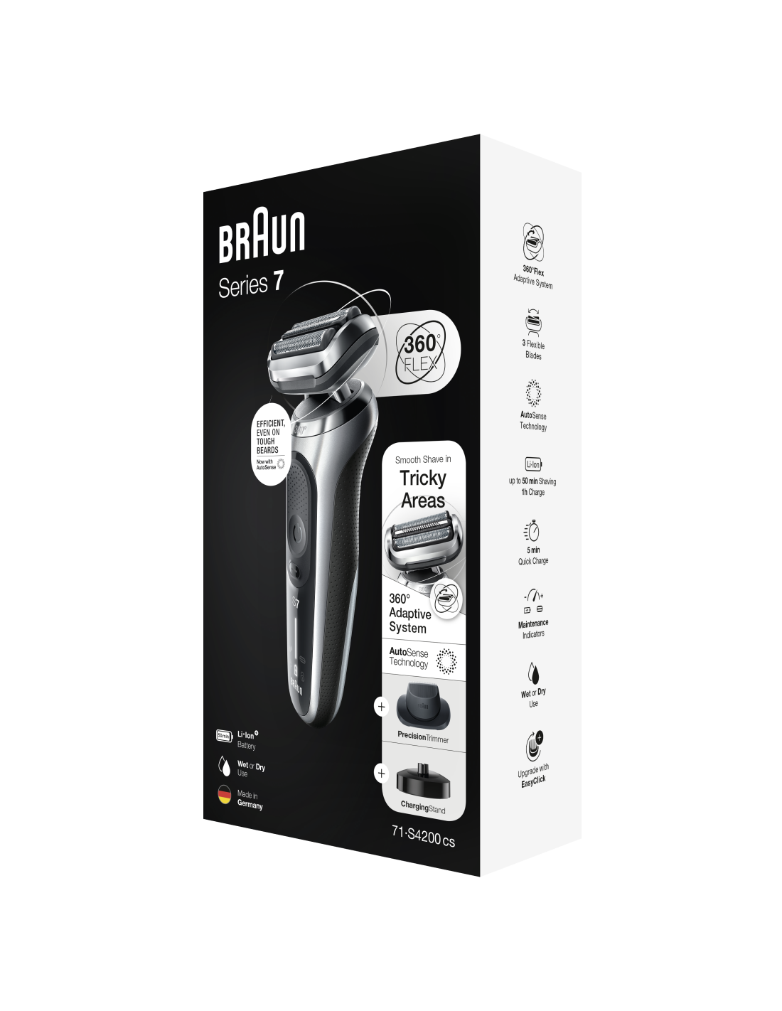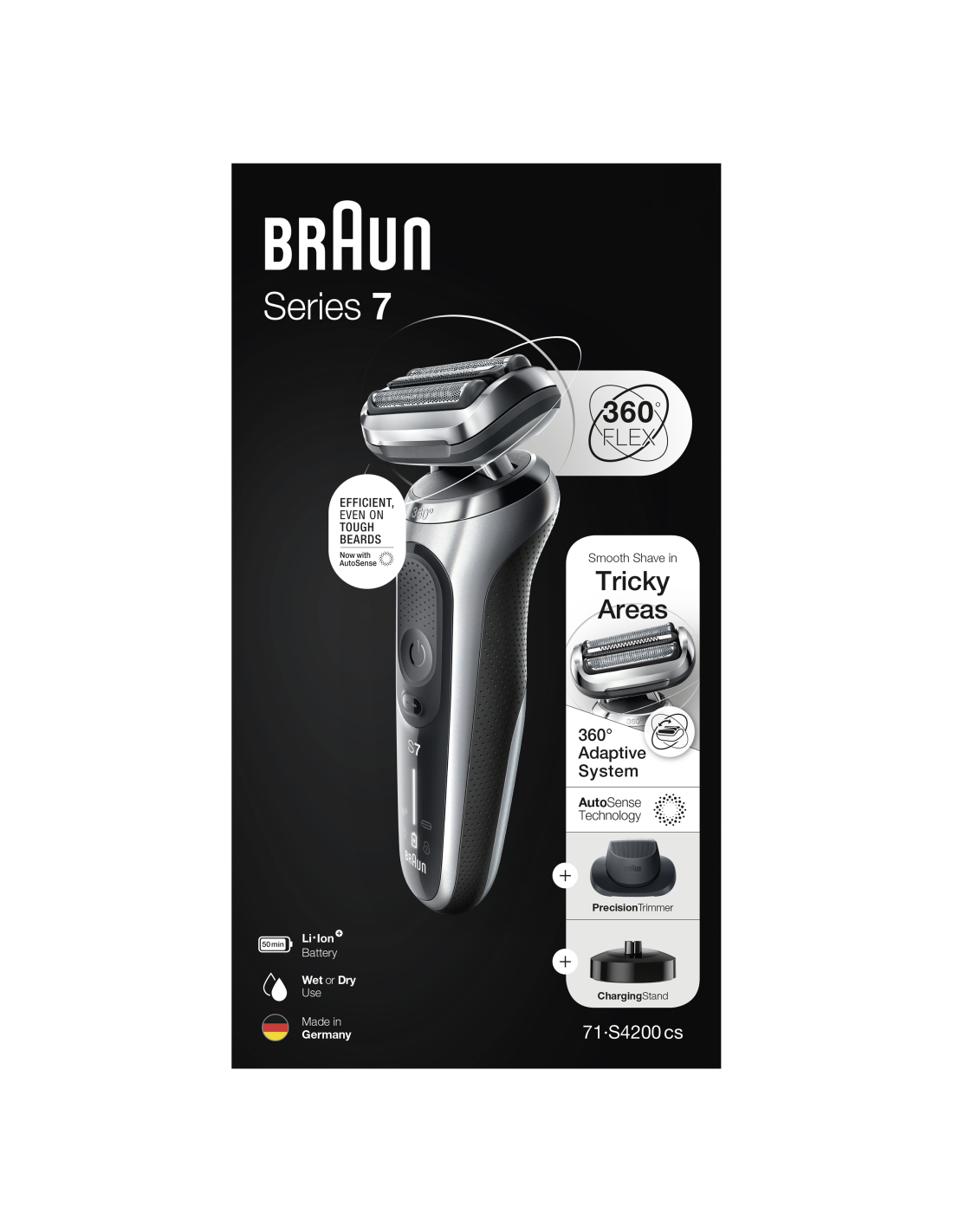 Braun Series 7 7 1-S4200cs elektripardel ja laadimisalus, täpne piiramistarvik, märg- ja kuivkasutus, laetav, juhtmeta võrguga pardel, hõbedane