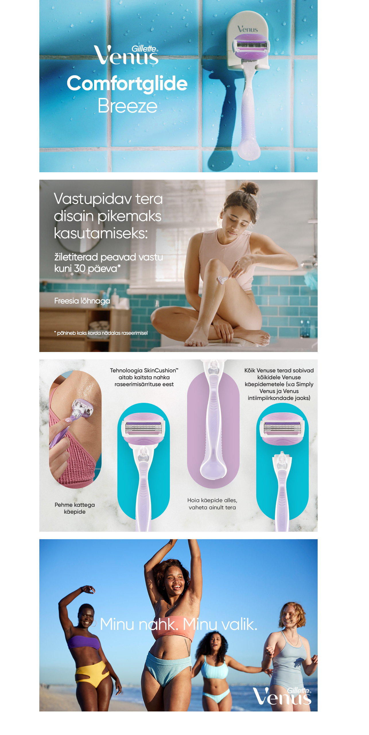 Hellitage oma nahka Venus ComfortGlide Breeze’i naiste raseerija teradega. 3 kontuure järgivat tera ja lisatud seebiribad, millest eraldub luksuslikku freesialõhnalist kehavõiet, tagavad uskumatu libisevuse, mugavuse ja unustamatu raseerimiskogemuse.