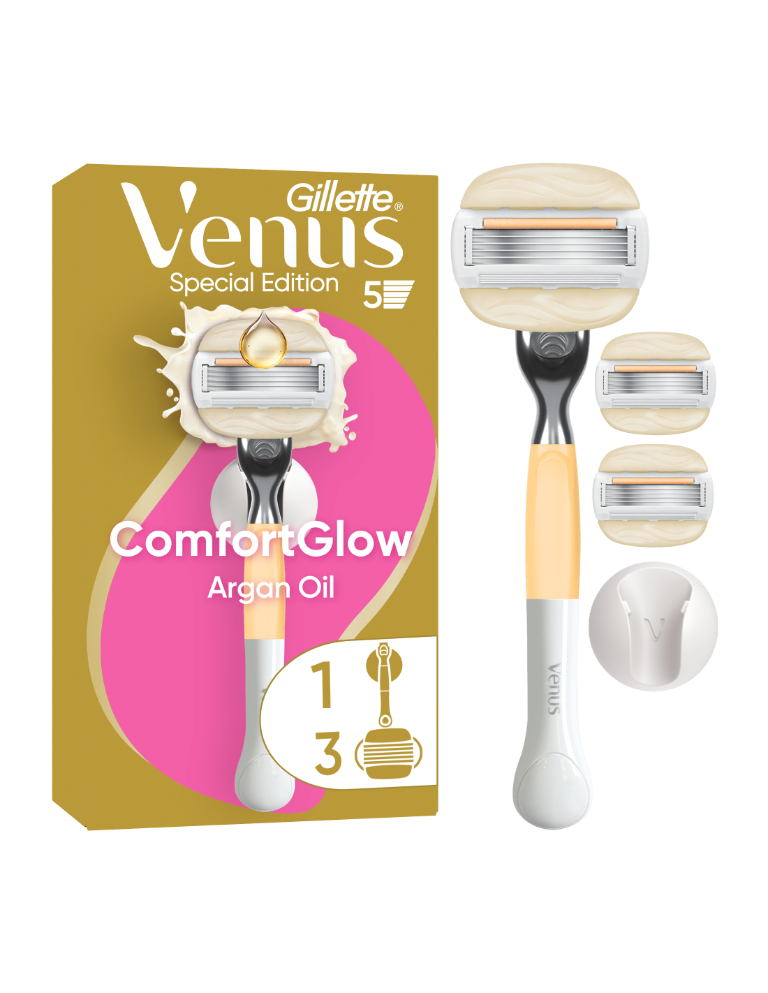 Gillette Venus ComfortGlow Argan Oil Raseerija, 3 Vahetustera, Seinahoidik