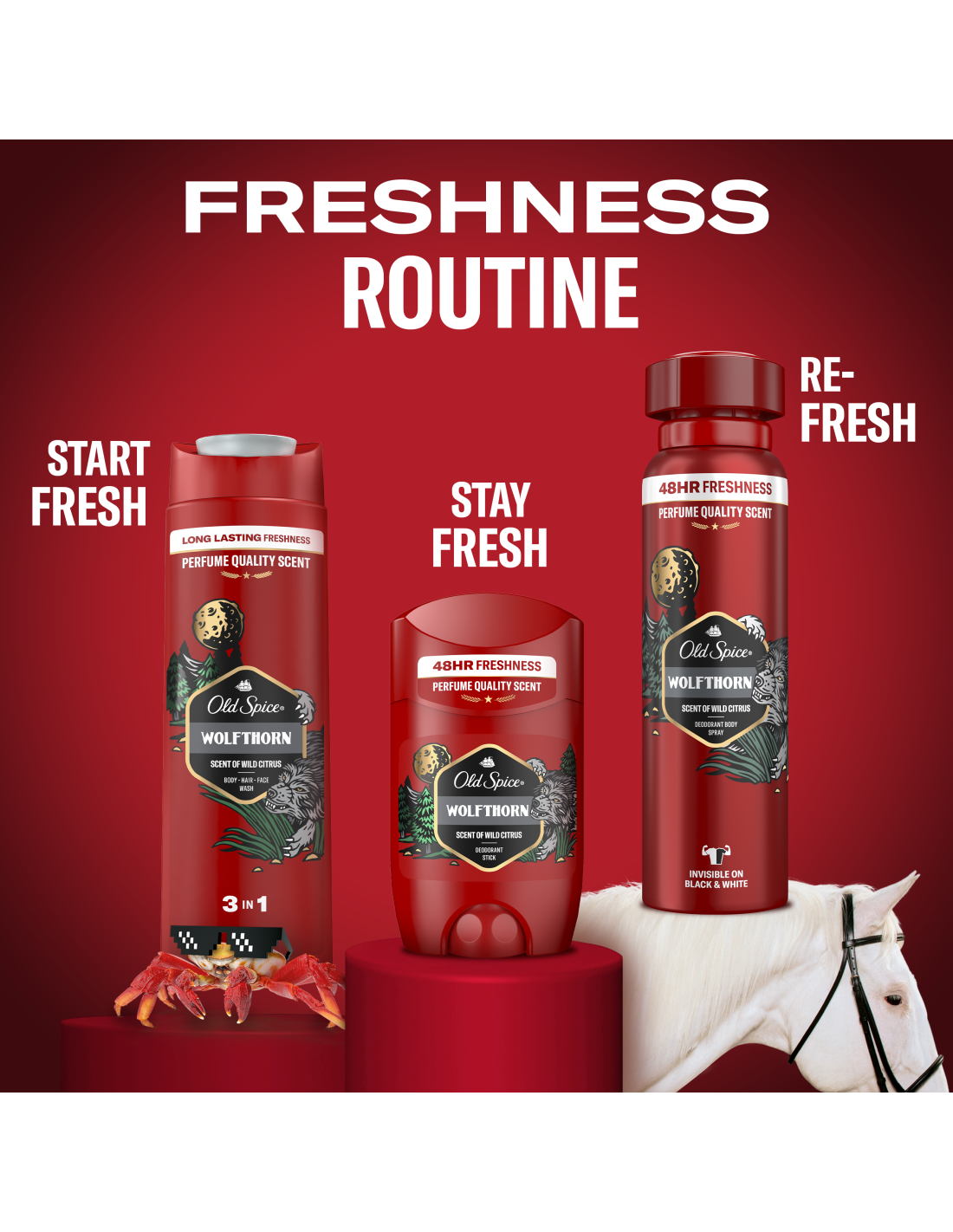 Kes oleks osanud arvata, et Wolfthorni metsik lõhn võitleb veidi värskust kaotanud ja seltskondlikult vastuvõetamatute kehalõhnadega? Võib-olla Aristoteles ja kõnelevad öökullid teadsid sellest, aga tavalistel inimestel ja tummadel öökullidel polnud sest aimugi. Maa peal elutsevate loomade ja inimeste seas on vaid üks liik, mis on piisavalt nutikas, et lõhnata nagu kõigist kõige külgetõmbavam, kuid ühtlasi hirmuäratavaim loom - nimelt inimene. Ta lõhnab, nagu lõhnaks hunt, kui tal oleks ligitõmbava mehe lõhn. Nii meil siin maa peal need asjad käivad. Kui soovid loomariigis edukas olla, pead esmalt õppima Old Spice Wolfthorni abil hästi lõhnama. Old Spice’i dušigeel annab värskendava lõhna meestele ja öise eluviisiga olenditele, kes ei karda oma mehelikkust (ega dušigeeli).
