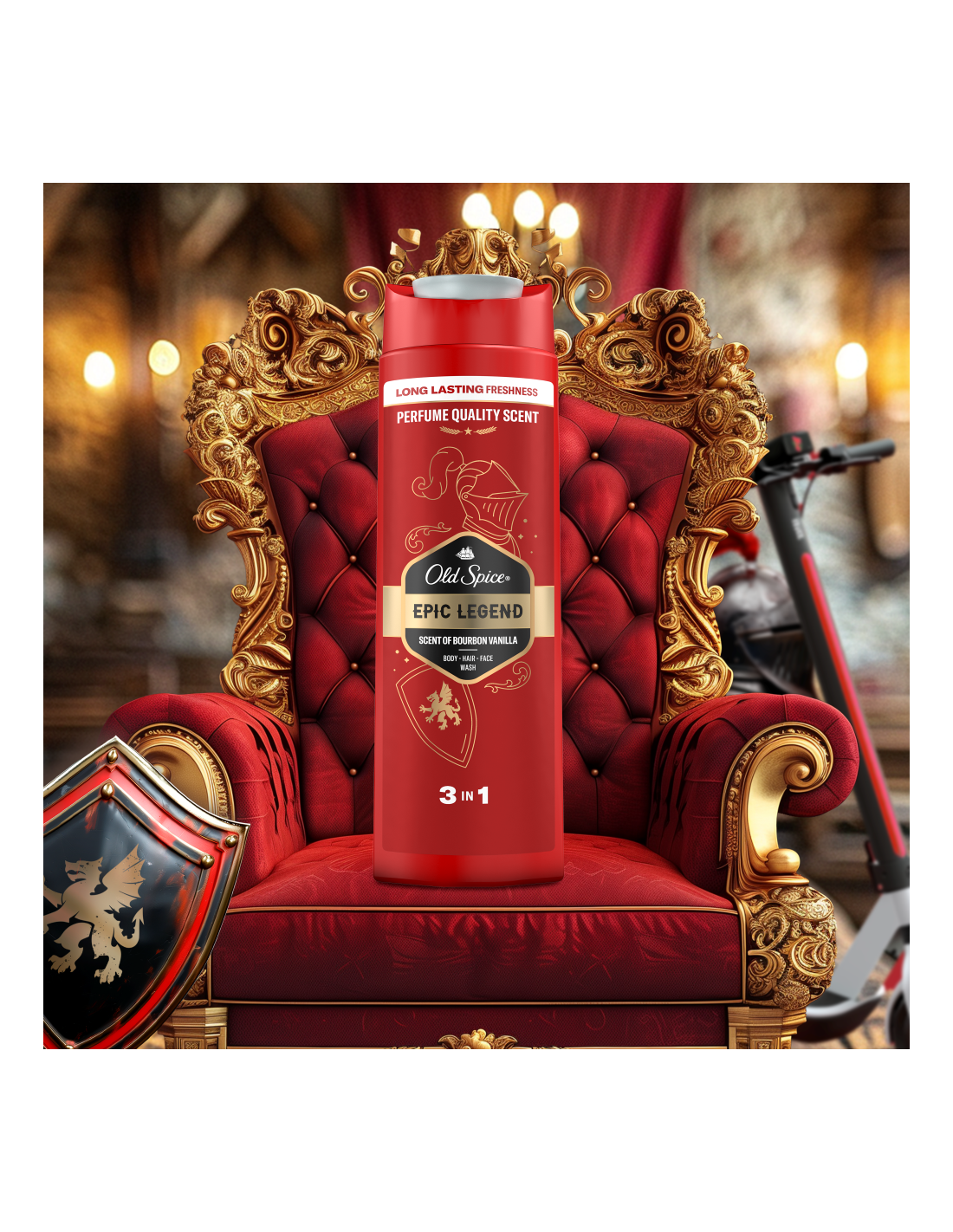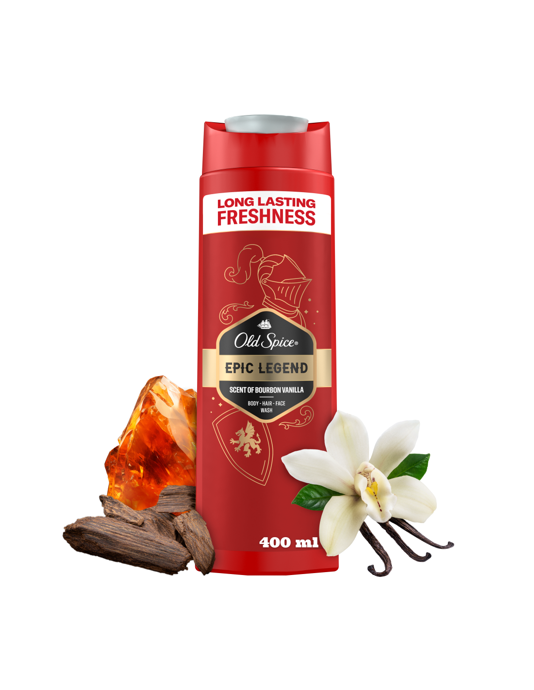 Naudi unustamatut kauakestvat värskust ja heast lõhnast tulevat enesekindlust tänu meestele mõeldud dušigeelile ja šampoonile Old Spice Epic. Sügavpuhastava koostise ja parfüümikvaliteediga aroomiga eemaldab see mustuse ja ebameeldiva lõhna, jättes sind värskeks ja puhtaks. Universaalne kolm-ühes koostis toimib juustel, näol ja kehal, jättes naha vastupandamatult siledaks, nii et saad keskenduda tähtsamatele tegevustele, nagu kasulike kokkulepete sõlmimine või delfiinide rääkima õpetamine. Bourboni vanilje, kirsitubaka, suitsutatud tammepuidu ja sooja ambra lõhn muudab sind tõeliseks värskuse rüütliks.