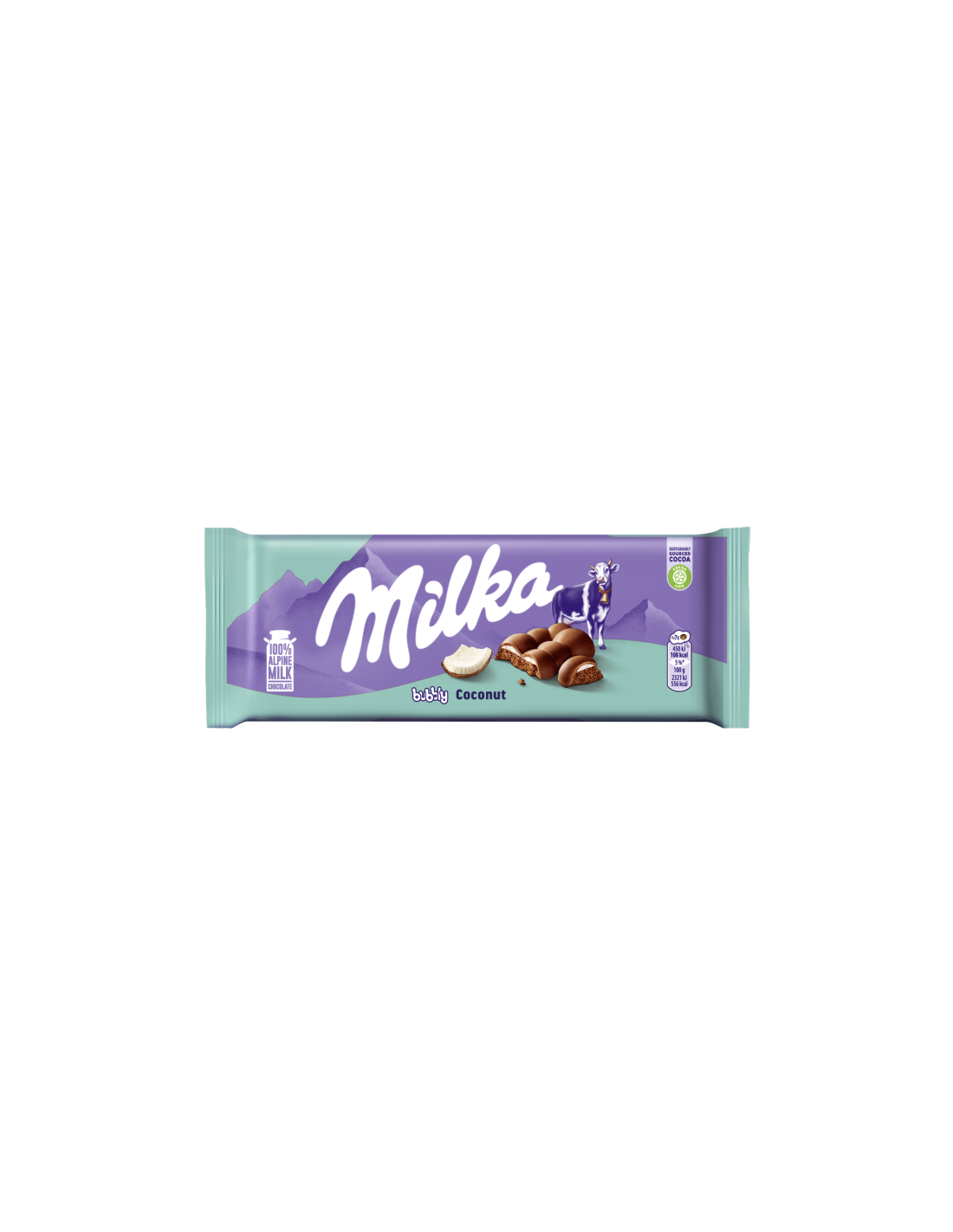 Milka Bubbly kookospiimašokolaadibatoon ühendab siidise Alpi piimašokolaadi kerge, vahutava tekstuuri ja mahlase kookostäidisega.