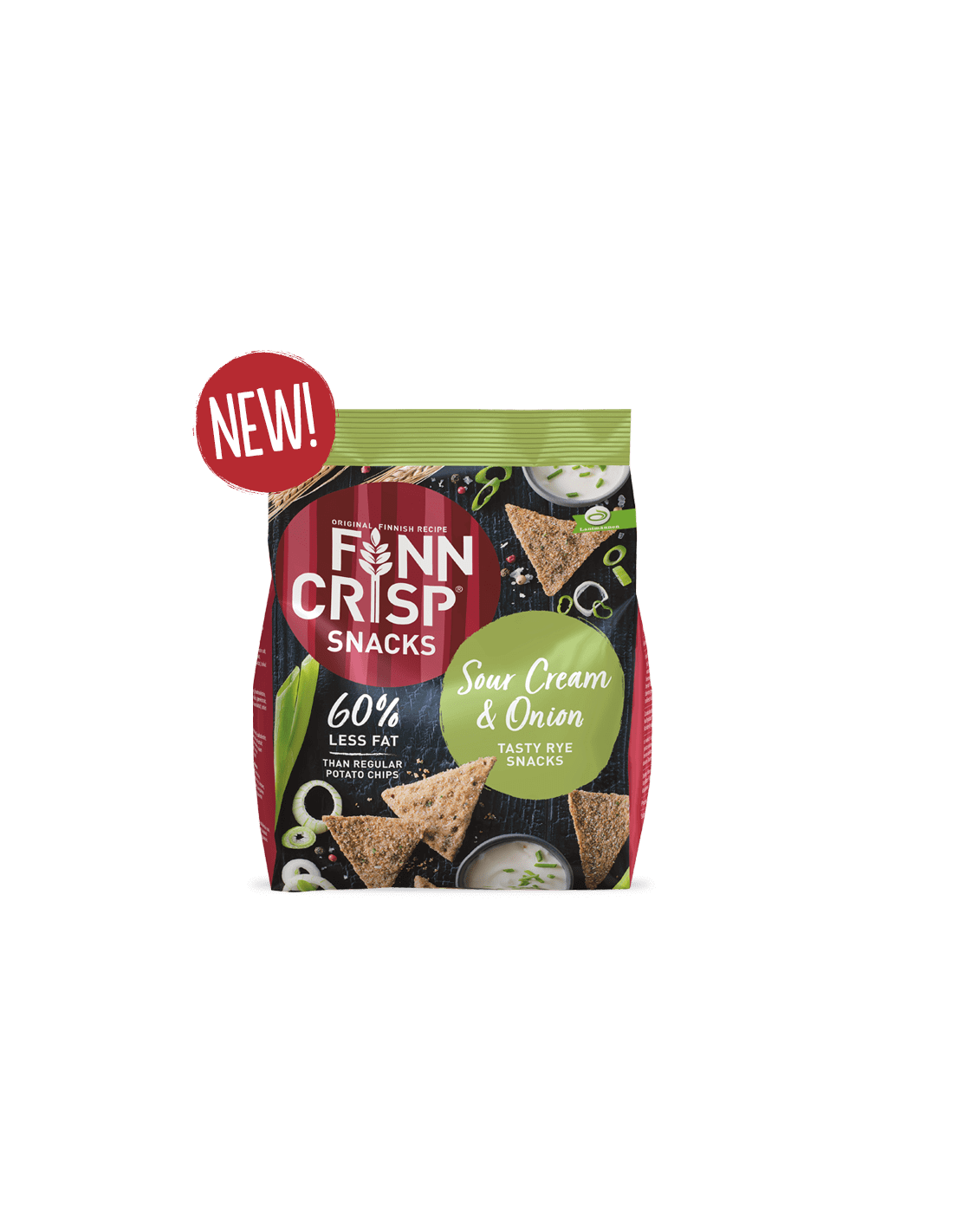 UUS! FINN CRISP rukkisnäkid hapukoore ja sibulaga on küpsetatud 100% täistera rukkijahust ja päevalilleõliga, millele on lisatud vürtse.