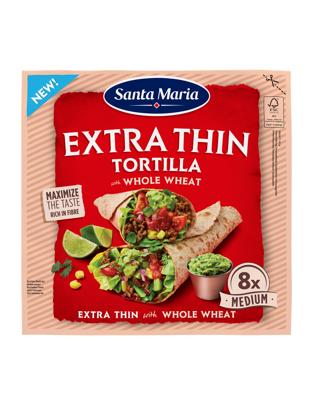 Santa Maria eriti õhuke täisterajahuga nisutortilla on kiudainerikas ja ideaalne takode, wrappide ja muude Tex-Mex roogade valmistamiseks.