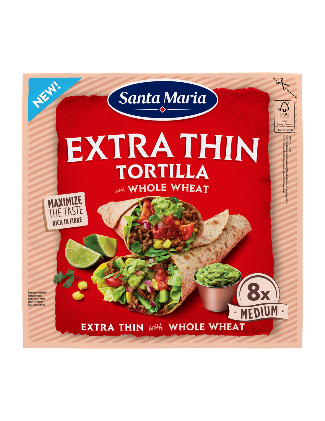 Santa Maria eriti õhuke täisterajahuga nisutortilla on kiudainerikas ja ideaalne takode, wrappide ja muude Tex-Mex roogade valmistamiseks.