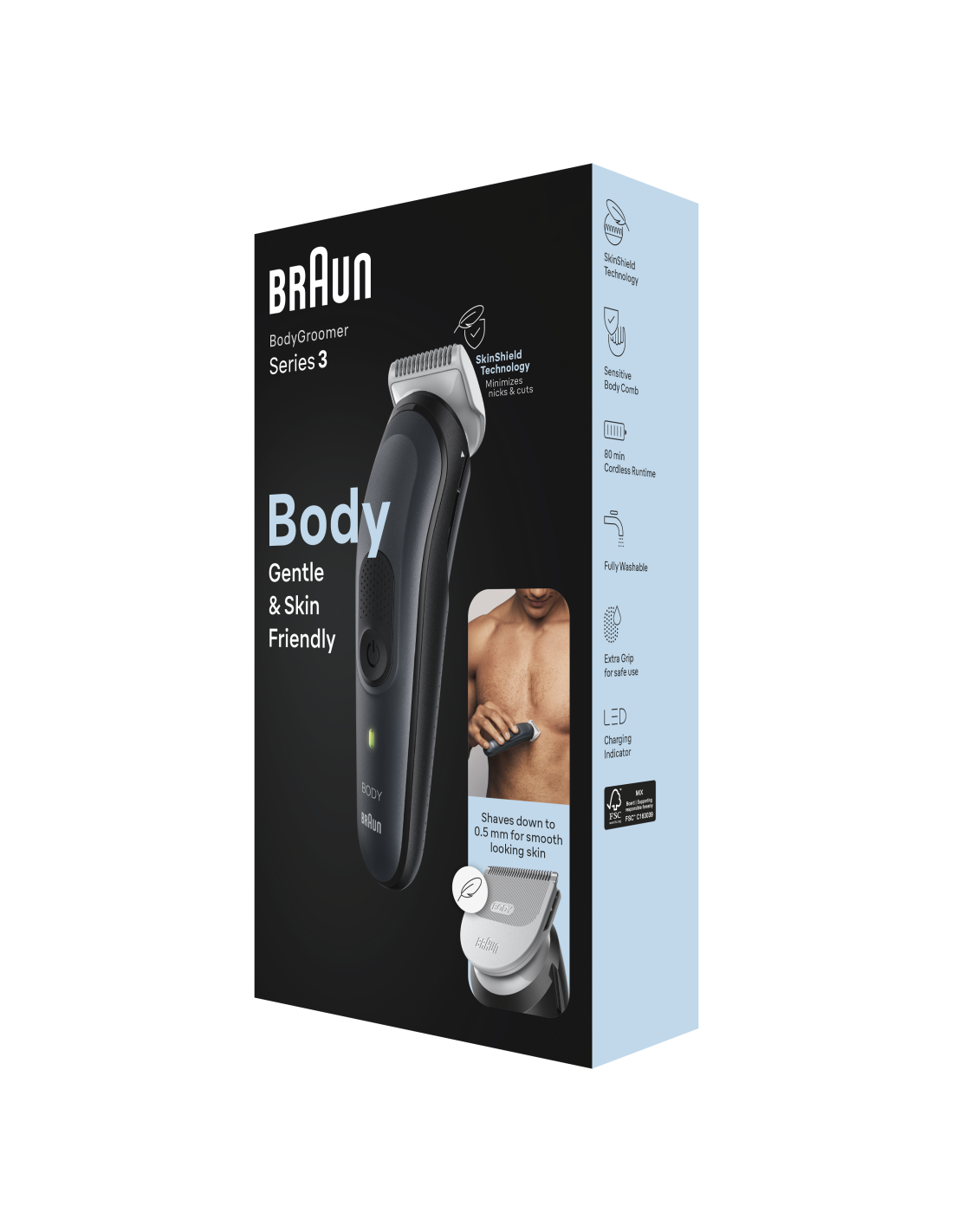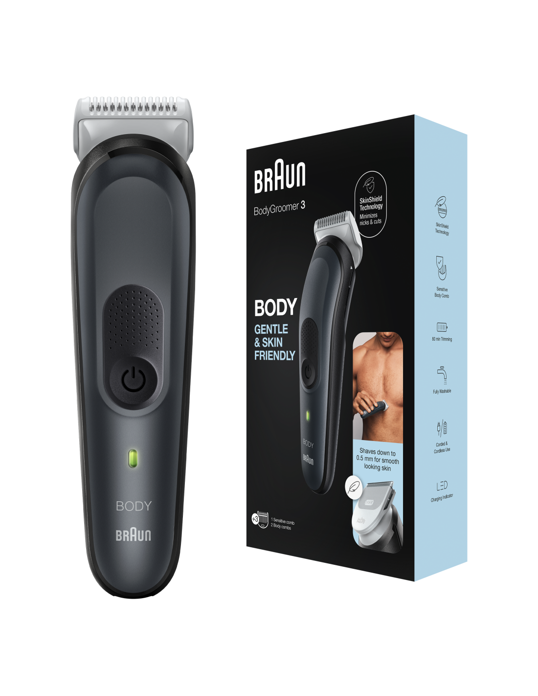 Braun kehapardliga saate mugavalt oma keha raseerida. Sellel kehapardlil on SkinShield-tehnoloogia, mis kaitseb nahka ka kõige tundlikumates piirkondades — seega saate kõikjalt julgelt raseerida. Disainitud ülimaks mugavuseks, sest tundlik kamm takistab teral vastu nahka puutumast. Seadmel on lai lõikeala, nii et iga tõmbega haaratakse ja lõigatakse rohkem karvu — nii saate end kiiremini raseeritud.