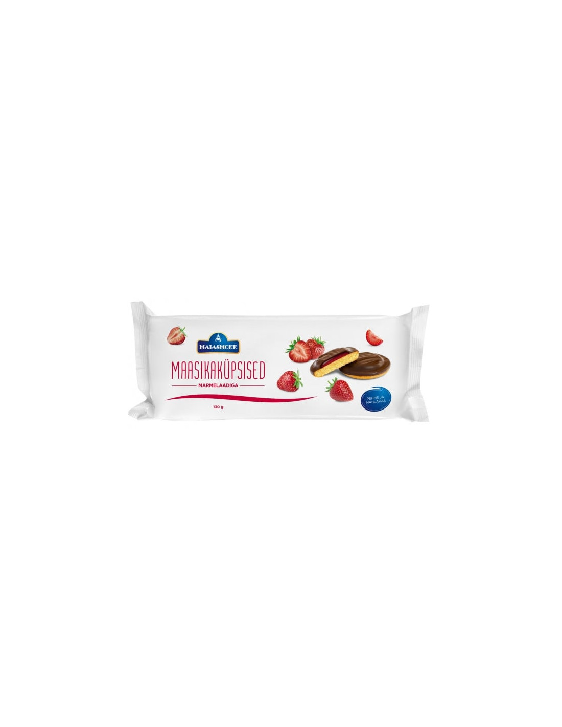 Sokolaadiga kaetud maasikamarmelaadiga küpsised biskviitpõhjal.